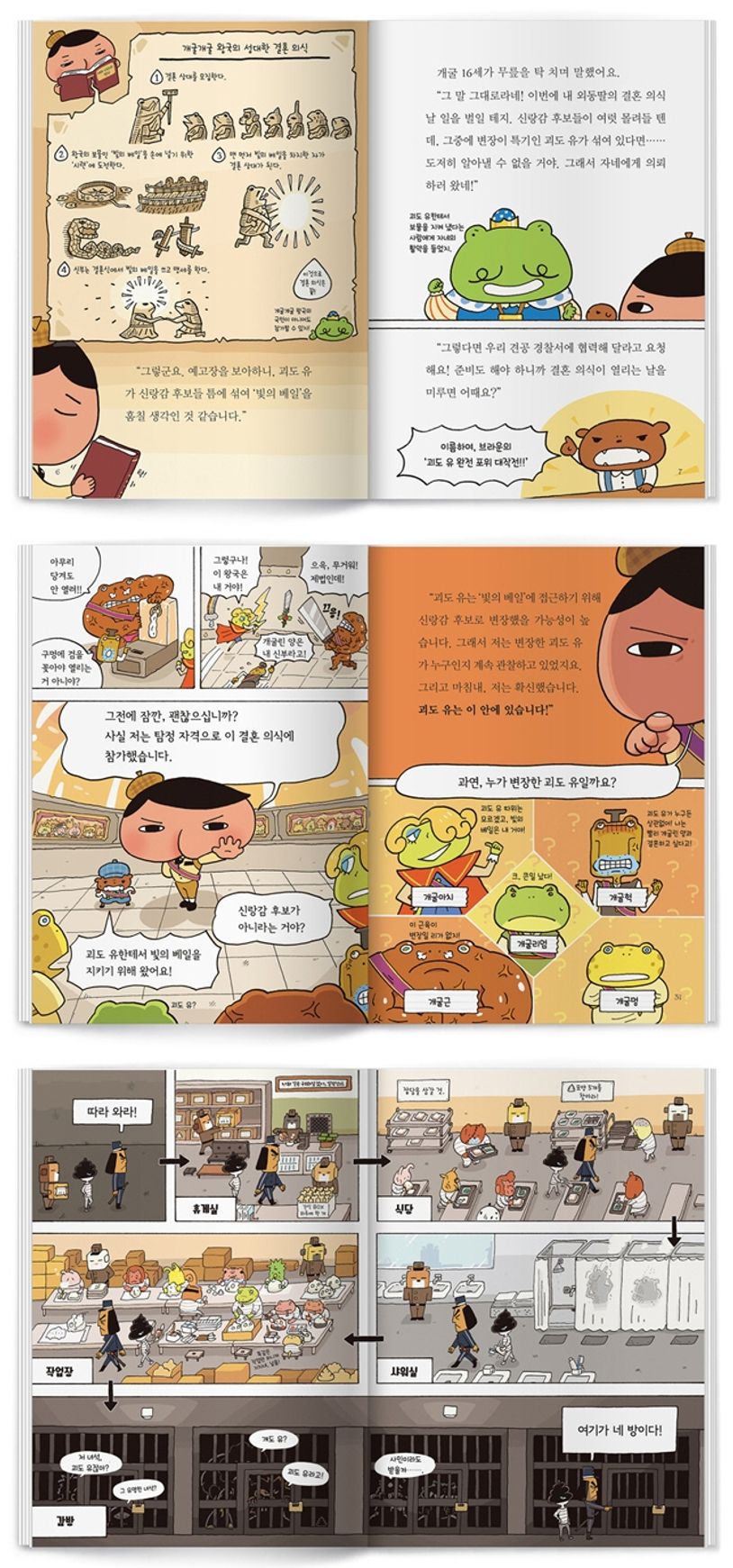 제8권 《괴도와 납치된 신부 사건》은 초등 저·중학년 수준에 딱 맞는 추리 난이도를 설정, 어린이 독자들이 자신의 추리력을 시험해 볼 수 있도록 기발한 사건들을 다뤘습니다. 어느 날, 아침 식사를 하던 엉덩이 탐정과 브라운에게 왠지 낯익은 의뢰인이 찾아옵니다. 의뢰인은 소파에 걸터앉아 아무 말도 하지 않지만, 관찰력이 뛰어난 엉덩이 탐정은 낯익은 의뢰인이 개굴개굴 왕국의 국왕인 ‘개굴 16세’라는 사실을 금세 알아차립니다.