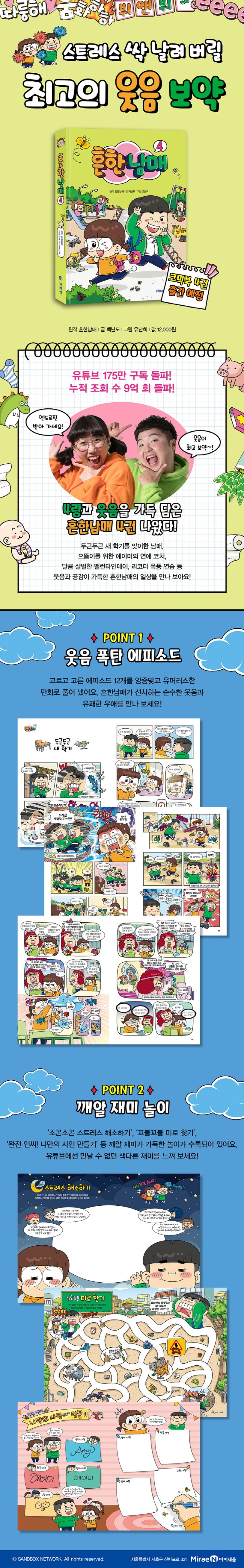 《흔한남매 4》는 ‘흔한남매’ 유튜브 영상의 스토리를 앙증맞고 유머러스한 만화로 풀어 낸 코믹북입니다. 하루도 조용할 날이 없는 으뜸이와 에이미의 일상 스토리는 진짜 웃음이 필요한 어린이들에게 순수한 웃음과 유쾌한 우애를 선사할 것입니다.