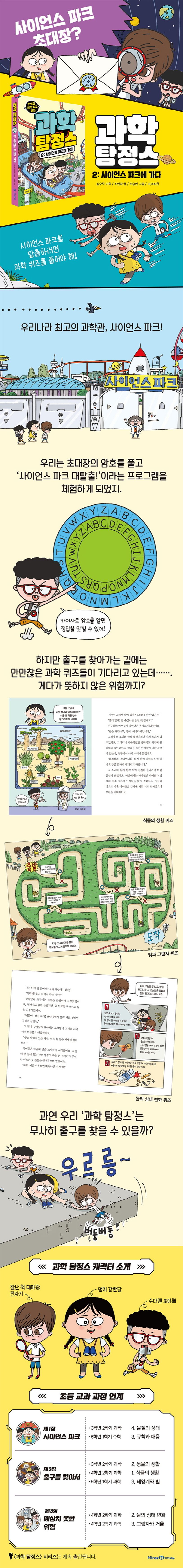 의뢰다운 의뢰가 없어 아쉬워하던 과학 탐정스. 그러던 중 담임 선생님인 고란 선생님에게서 우리나라 최고의 과학관, 사이언스 파크 초대장을 건네받게 된다. 과학 탐정스는 암호를 풀고 당당히 사이언스 파크에 들어간다. 하지만 그들 앞에 펼쳐진 건 다섯 고개 풀기, 힌트를 보고 길 찾기, 정원 미로 탈출하기 등 알쏭달쏭 과학 퀴즈들! 거기에 아이들을 덮친 뜻밖의 위기까지? 과연 아이들은 과학 퀴즈를 풀고, 사이언스 파크를 탈출할 수 있을까?