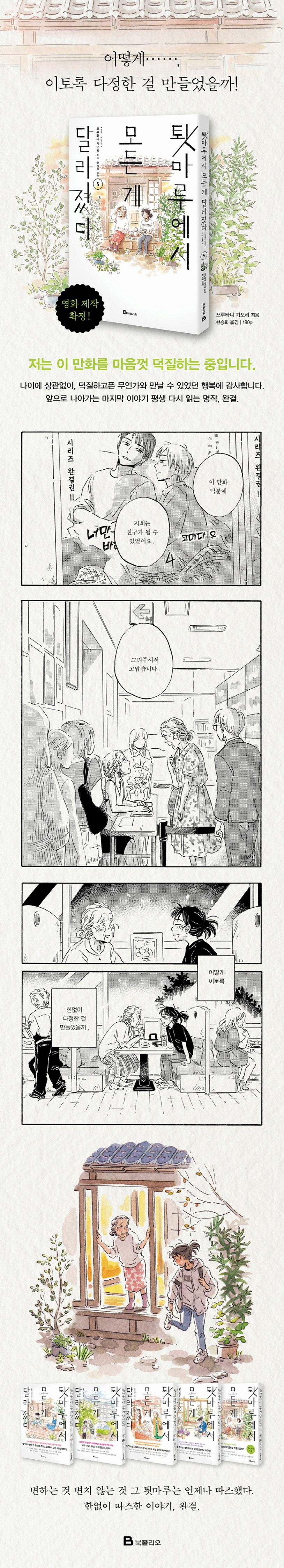 나와 다른 누군가와 같은 감정을 공유하고 좋아하는 이야기를 나눈다는 게 얼마나 두근거리는 일인지 새삼 일깨워 주는 《툇마루에서 모든 게 달라졌다》는 할머니와 우라라의 우정뿐만 아니라 두 사람의 가족, 친구들과 나누는 소소한 일상까지 담고 있다. 인생이 정체되는 것만 같던 각자의 순간에 마주한 그들만의 소중한 시간. 오래오래 함께할 것만 같던 이치노이 할머니와 우라라는 정말 언제까지나 소중한 추억을 나눌 수 있을까? 《툇마루에서 모든 게 달라졌다》 마지막 권에서 아련하고도 따스한 이야기를 만나보자.