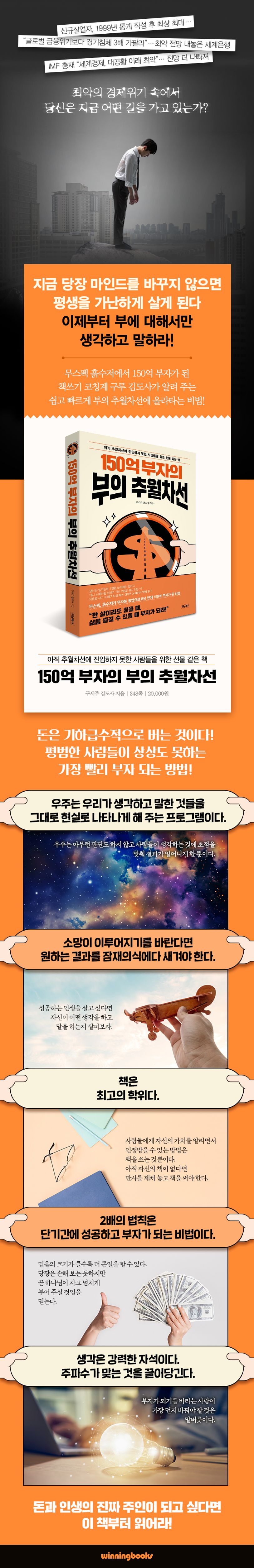 그들과는 정반대로, 하루하루가 즐겁고 인생이 천국 그 자체라 생각하는 사람이 있다. 그 역시 과거에는 돈 걱정으로 시간을 흘려보냈으나 의식을 바꾼 이후 현재는 150억 부자가 되어 많은 이들의 부러움을 한 몸에 받고 있다. 24년간 250권의 책을 출간하고, 9년간 ‘한국책쓰기1인창업코칭협회(한책협)’를 운영하며 1,000명을 작가, 코치, 강연가, 1인 창업가로 양성한 ‘구세주 김도사’가 그 주인공이다. 무스펙 흙수저라는 틀에 얽매이지 않고 자신의 스토리를 담은 책을 씀으로써 인생의 판을 뒤엎은 그는 ‘책쓰기 코칭계의 구루’라고 불리며 수많은 이들의 책쓰기와 성공 멘토로 활약하고 있다. 그가 삶의 경험과 깨달음, 지식과 정보, 원리와 비법을 모두 풀어 담은 것이 바로 이 책 《150억 부자의 부의 추월차선》이다. 하루라도 빨리 직장이라는 사막에서 벗어나 좋아하는 일을 하며 수익을 창출하고 싶다면 지금 바로 이 책을 만나야 한다.