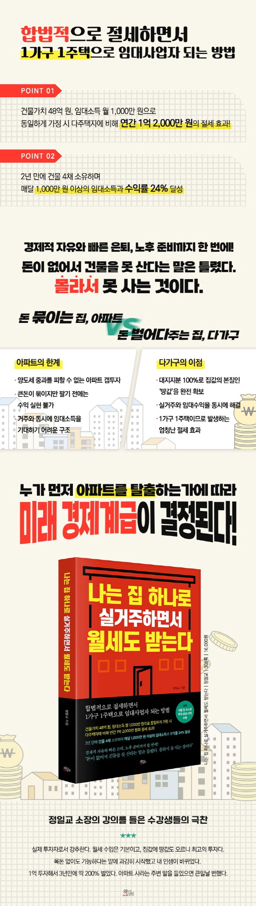 그런데도 우리는 통상 ‘내 집 장만’이라고 하면 대부분 아파트 구입을 생각한다. 《나는 집 하나로 실거주하면서 월세도 받는다》의 저자 정일교 소장은 “이제 아파트가 아닌 다른 형태의 집을 이야기해야 한다”고 오래 전부터 주장해왔다. 바로 “직접 거주할 수 있으면서 임대수익도 얻을 수 있는 다가구주택”이다. 정 소장은 무일푼으로 시작해 2년 만에 건물 4채를 소유하며 매달 1,000만 원 이상의 임대소득을 올리며 자신의 지론을 실제로 증명했다.