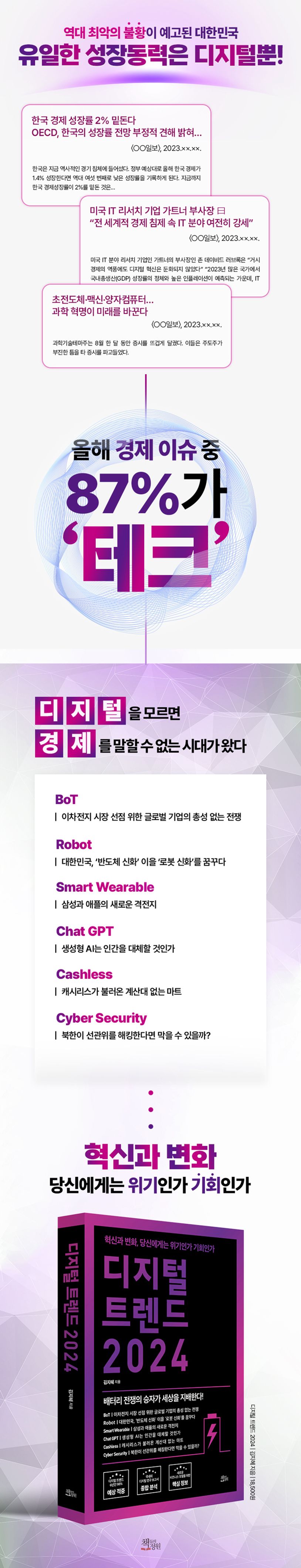 전 세계적 불황에도 불구하고 디지털 산업은 매년 새로운 가치를 창출하며 IT를 넘어 전 산업 시장에 지대한 영향을 끼친다. 2023년 불황의 시대에서도 꺼지지 않는 등불이 되었던 디지털 산업의 저력은 과연 어떤 모습으로 이어지게 될지 《디지털 트렌드 2024》을 통해 확인해보자.