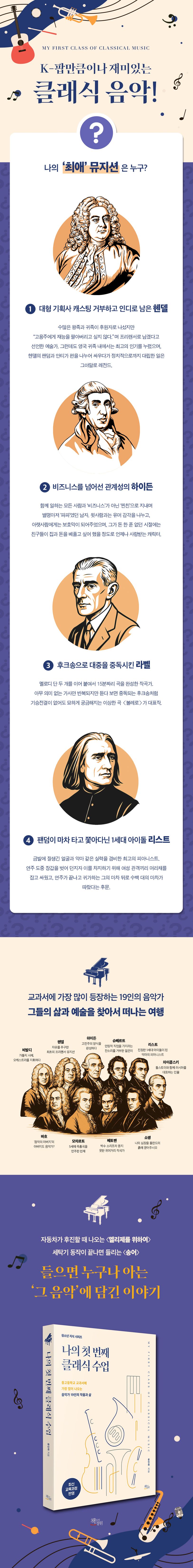 저자 류인하는 팟캐스트 차트 1위를 기록한 〈이지 클래식〉의 운영자로 클래식의 대중화에 기여했다는 평가를 받는다. 이번 책에서도 어려운 용어나 어휘를 최대한 사용하지 않았으며, 쉽고 친절한 말투를 유지해 청소년은 물론 성인까지 클래식에 입문하고 싶은 모든 이에게 다가간다. 바로크에서 고전주의를 거쳐 낭만주의·민족주의·인상주의로 이동하며 시대별 대표 작곡가와 작품을 소개했다.