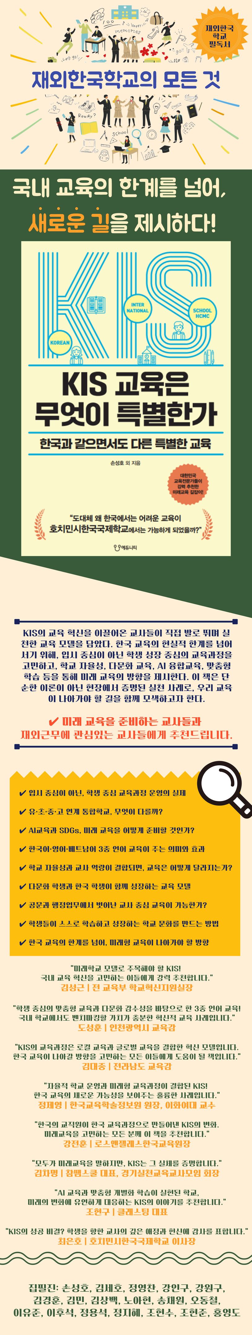한국이 아닌 외국에서 한국인 교사가 한국 교과서를 가지고 한국 교육과정을 똑같이 운영하면서도 어떠한 점 때문에 이렇게 인기가 있는 것일까? 그 비결은 한국과 같으면서도 다른 특별한 교육들이 있기 때문이다. 이 학교는 한국학교이면서도 동시에 글로벌 국제학교로서의 모습과 다문화 통합학교로서의 모습도 갖추고 있다. 최근 한국의 학교들이 나아갈 길을 잃고 여러 가지 어려움을 겪고 있는 상황 속에서 우리는 KIS의 사례를 통해 향후 국내 학교들이 어떻게 나아가야 할지 살펴볼 필요가 있다. KIS의 실천 사례를 우리 교사들이 미래학교를 위한 건강한 상상으로 읽어낼 것을 권한다.