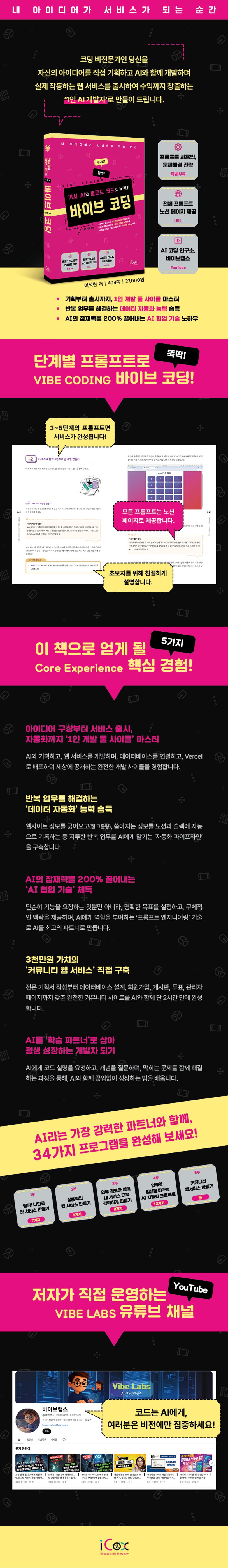 과거 웹 서비스 개발은 파이썬, 자바스크립트, 자료구조, 알고리즘, 데이터베이스 등 수많은 기술의 장벽 앞에서 좌절하기 일쑤였다. 하지만 이 책은 ‘바이브 코딩’이라는 새로운 패러다임으로 기존의 장벽을 완전히 허문다. ‘바이브 코딩’이란, 복잡한 코드 대신 “이런 기능 만들어 줘”라고 AI에게 인간의 언어로 요청하고 함께 서비스를 완성해나가는 혁신적인 개발 방식이다.