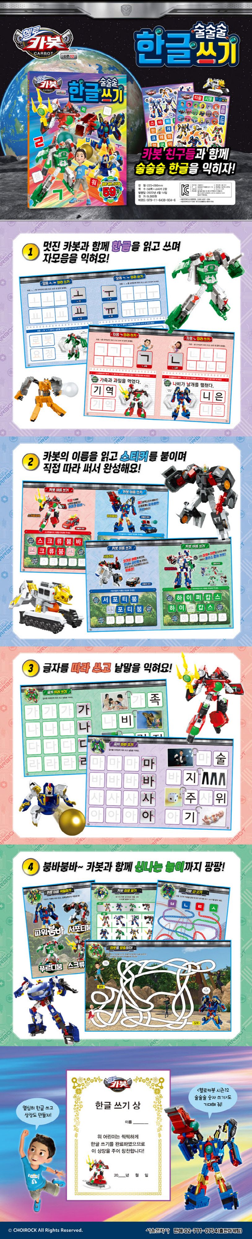 자·모음 따라 쓰기, 카봇 이름 쓰기, 낱말 쓰기 등 카봇과 함께 열심히 따라 쓰다 보면 어느새 한글 실력이 술술술!