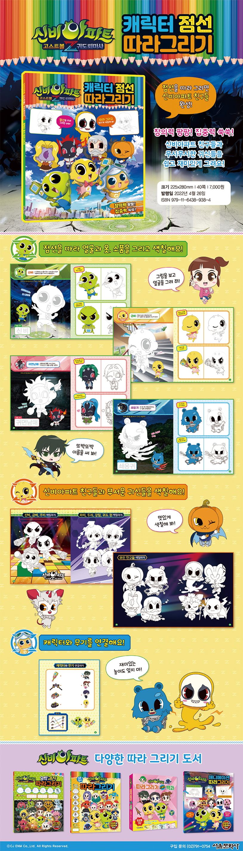 〈신비아파트 고스트볼Z 귀도퇴마사 캐릭터 점선 따라그리기〉에서 귀여운 신비와 금비, 오싹한 귀신, 멋진 신비아파트 친구들을 따라 그리고 색칠해요!