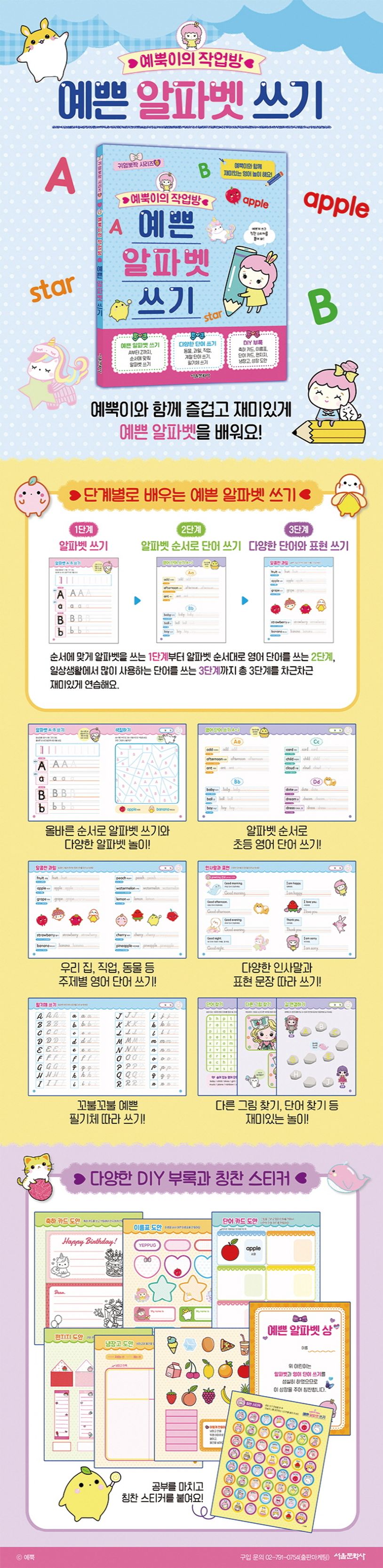 〈예뿍이의 작업방 예쁜 알파벳 쓰기〉는 순서에 맞게 알파벳을 쓰는 1단계부터 알파벳 순서대로 영어 단어를 쓰는 2단계, 일상생활에서 많이 사용하는 단어를 쓰는 3단계까지 총 3단계로 구성되어 있어요.