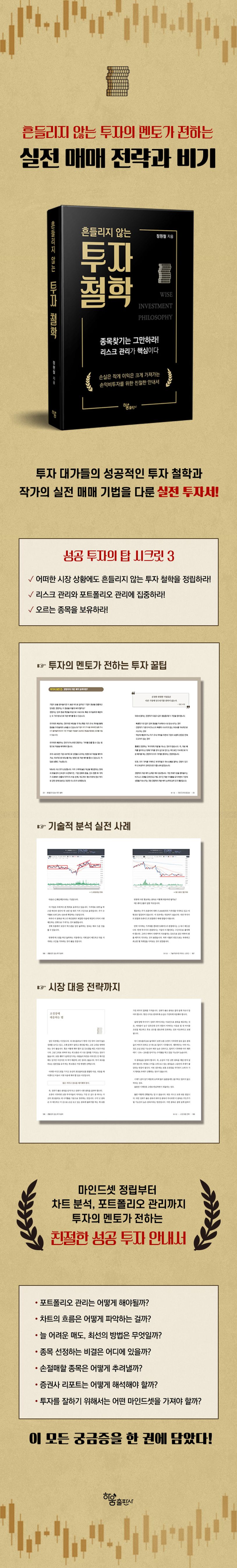 블로그와 카페 활동을 하며 꾸준히 투자에 대한 생각들을 글로 남기며 꾸준히 시장을 이기며 잃지 않는 투자 중인 정원철 작가의 「흔들리지 않는 투자 철학」은, 심리적으로 흔들리지 않는 마인드셋을 갖추고 투자에 대해 전반적으로 이해할 수 있게 돕는 책이다.