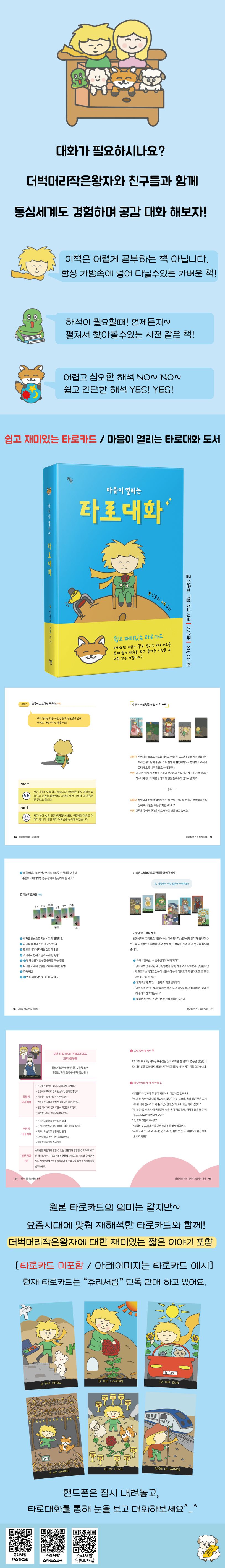 《마음이 열리는 타로 대화》는 어렵게 외우거나 공부하는 책이 아닙니다. 자신 또는 상대방이 카드를 선택하면 선택된 카드를 보면서 공감 대화를 나누고 함께 의미를 찾아보며 눈을 맞추고 대화할 수 있게 도와주는 책입니다. 책 속의 그림책을 서로 읽어 주며 동심의 세계도 경험해 보면서 상상력을 발휘한다면 다양한 카드 놀이도 가능할 것입니다.