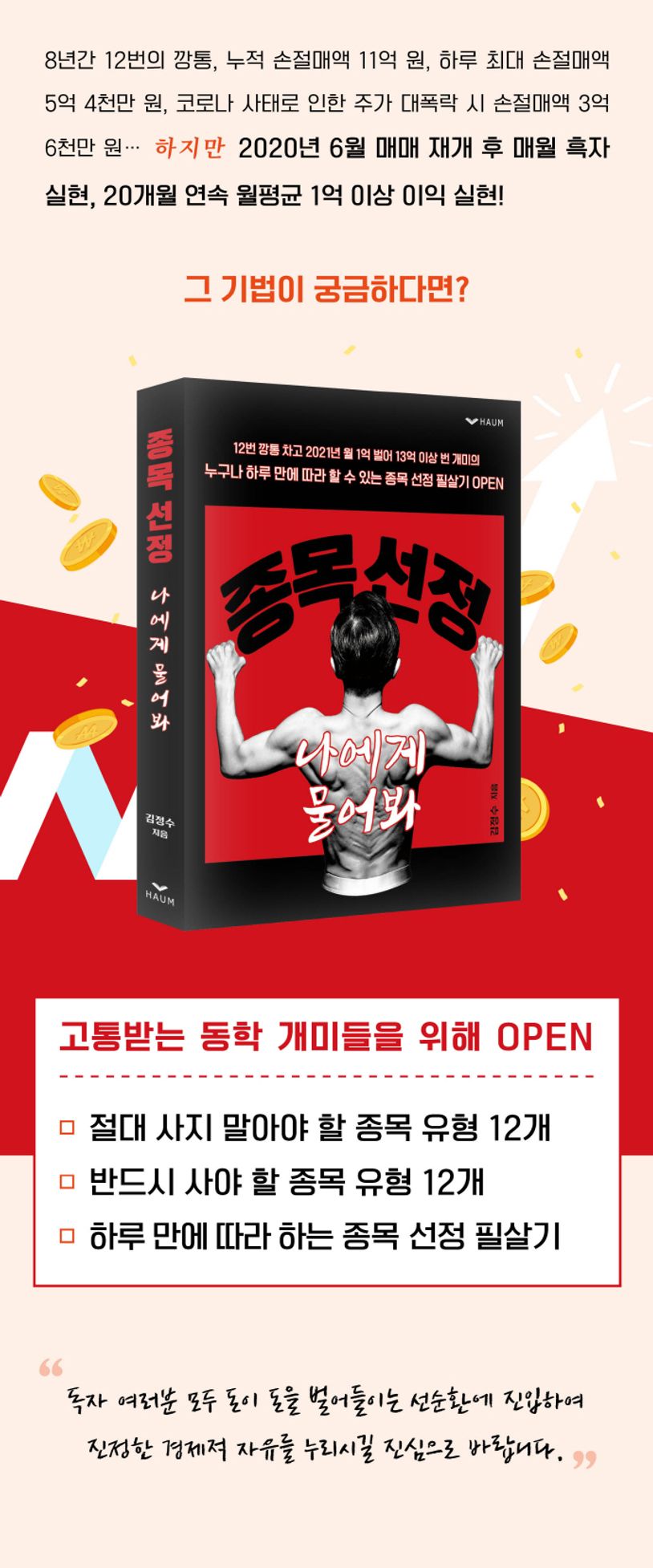 8년 동안 12번의 깡통, 누적 손절매액 11억 원, 하루 최대 손절매액 5억 4천만 원, 코로나 사태로 인한 주가 대폭락 시 손절매액 3억 6천만 원… 그러나 2020년 6월 매매 재개 후 매월 흑자 실현, 2021년 13억 이익 실현! 그 기법이 궁금하다면?