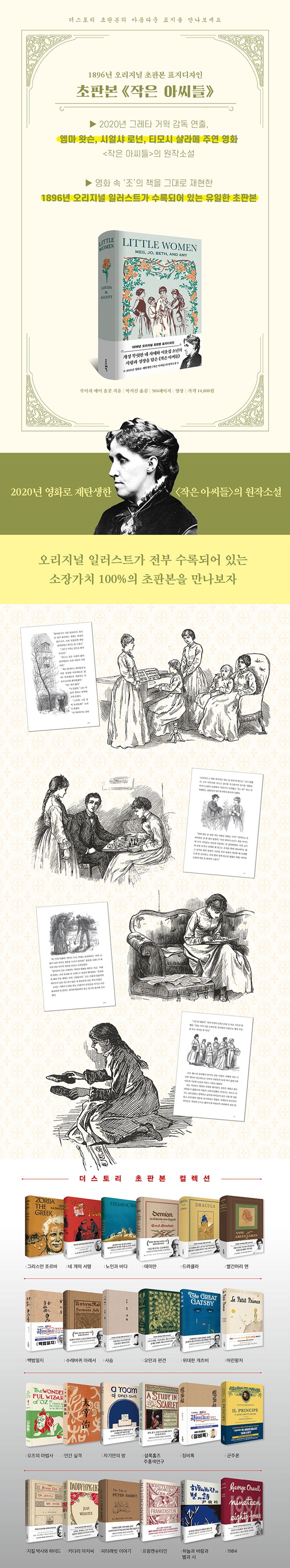 출간 이후 150여 년 동안 전 세계 독자들의 꾸준한 사랑을 받고 있는 클래식 ≪작은 아씨들≫이 더스토리 1896년 오리지널 초판본 표지디자인으로 새롭게 출간되었다. 아름다운 표지디자인뿐만 아니라 1896년 판본의 오리지널 일러스트를 수록한 특별판으로, 독자들이 소설을 읽으며 그 시대의 생활상과 분위기를 느낄 수 있도록 돕는다.
