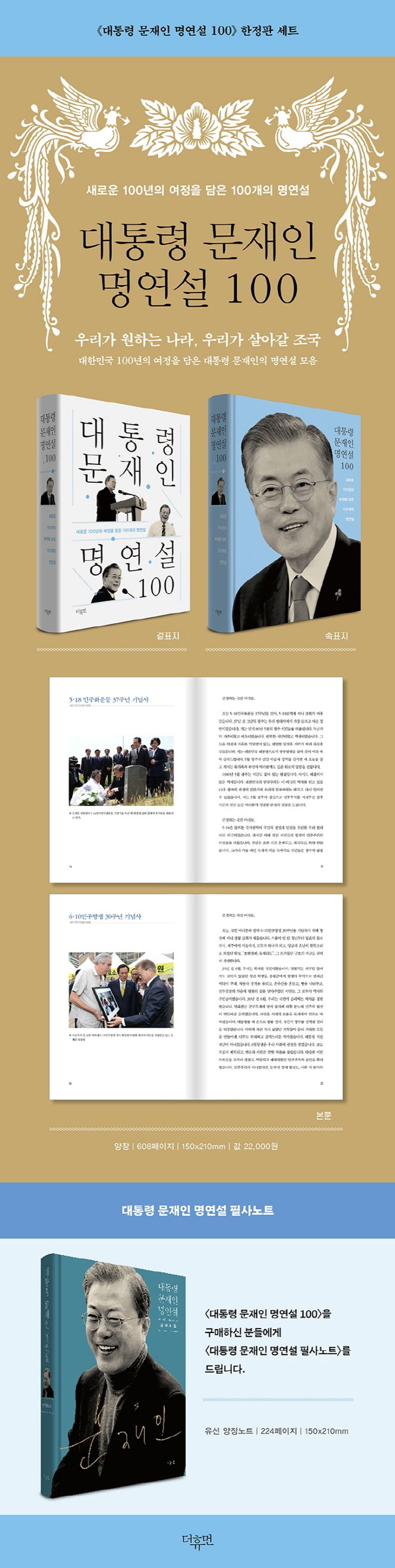 도서출판 더휴먼은 문재인 대통령의 5년간의 수많은 명연설 중 100편을 엄선해서 글로 담아 대한민국의 국격을 드높인 대통령으로서의 문재인 정부의 발자취를 기억하고 그의 정치 철학과 신념을 돌아보고자 한다. 이 책 《대통령 문재인 명연설 100》에는 한국판 뉴딜 ‘대한민국 인공지능’을 만나다, 제100주년 3·1절 기념사, 서울 국제 항공우주 및 방위산업 전시회 등에서 연설한 명연설들이 수록되어 있고 남북 평화와 자주국방, 국가 안보에 대한 그의 철학과 비전이 담겨 있다.