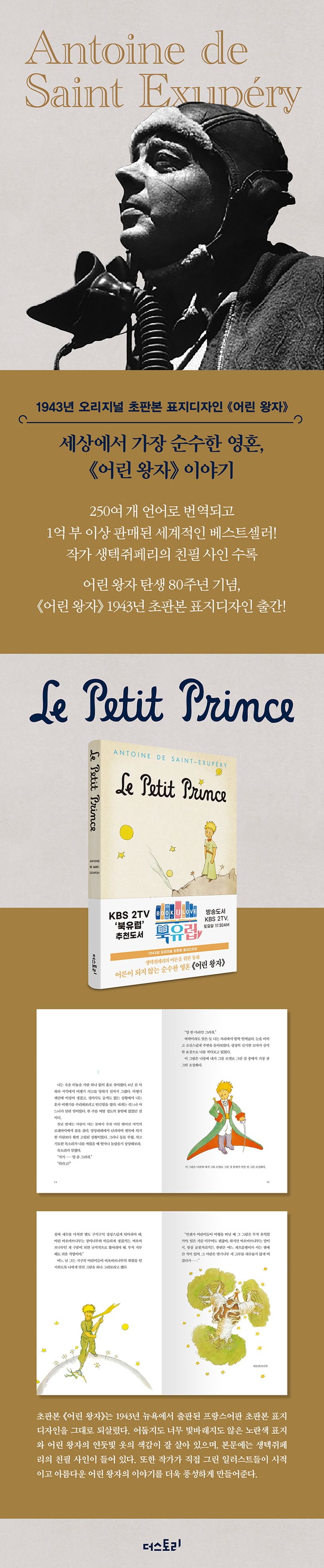 생텍쥐페리의 《어린 왕자》는 ‘독서하는 사람들의 통과의례인 명작’이라는 말이 있을 정도로 전 세계 독자들에게 큰 인기를 얻었다. 1943년, 출간 이후 꾸준히 사랑받아 스테디셀러로 자리매김했고, 세상에서 가장 순수한 영혼을 통해 진정한 삶의 가치와 의미를 전하는 걸작을 더스토리 초판본 표지디자인을 통해 만나 보자.