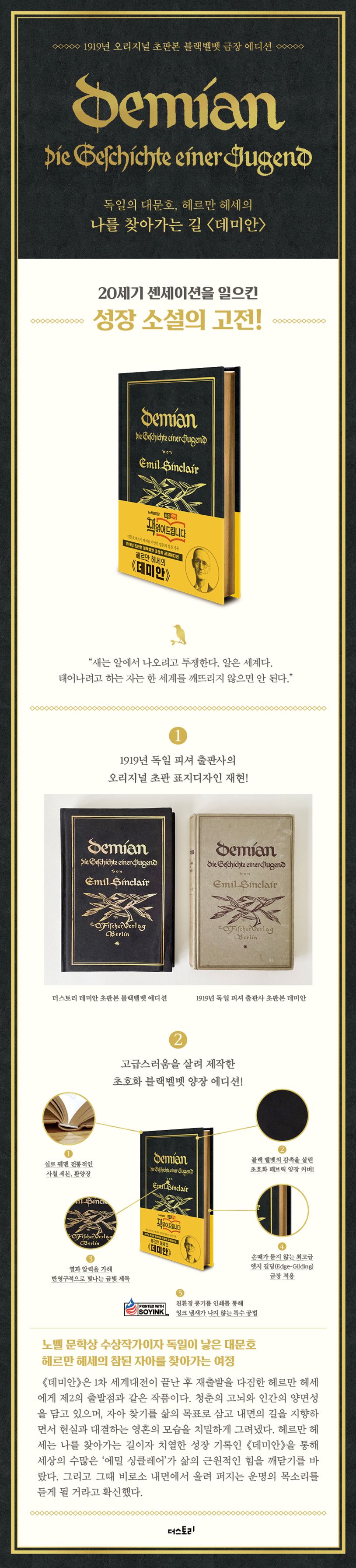 20세기 독일 문학가들 가운데 우리나라 독자들에게 가장 잘 알려진 작가를 꼽으라고 한다면 단연 헤르만 헤세일 것이다. 내면의 탐구자이자 자아 성찰의 대표 작가인 헤르만 헤세는 휴머니즘을 지향하며, 고뇌하는 청춘과 자연에 대한 동경, 인간의 양면성 등을 작품에 담았다. 도서출판 더스토리는 헤르만 헤르만 헤세의 대표작인 《데미안》을 초호화 양장 블랙벨벳 금장 에디션으로 제작하였다. 벨벳 특유의 고급스러운 색감과 감촉뿐만 아니라 1919년 출판된 독일 피셔 출판사의 초판본 표지디자인을 그대로 되살려 소장 가치를 한층 높였다. 또한 실로 꿰맨 정통적인 사철 제본을 통해 책의 내구성을 높이고 펼쳐 읽기도 편하게 만들었으며, 블랙벨벳을 더욱 돋보이게 하는 고급스러운 금박을 재현하고 금장 테두리를 둘러 오리지널 초판본의 품격과 가치를 담아냈다. 헤르만 헤세 전문 번역자이자 독일 문학 연구자인 역자의 깊이 있는 번역은 자서전적이고 철학적인 헤르만 헤세 문학의 감동을 고스란히 전해줄 것이다.