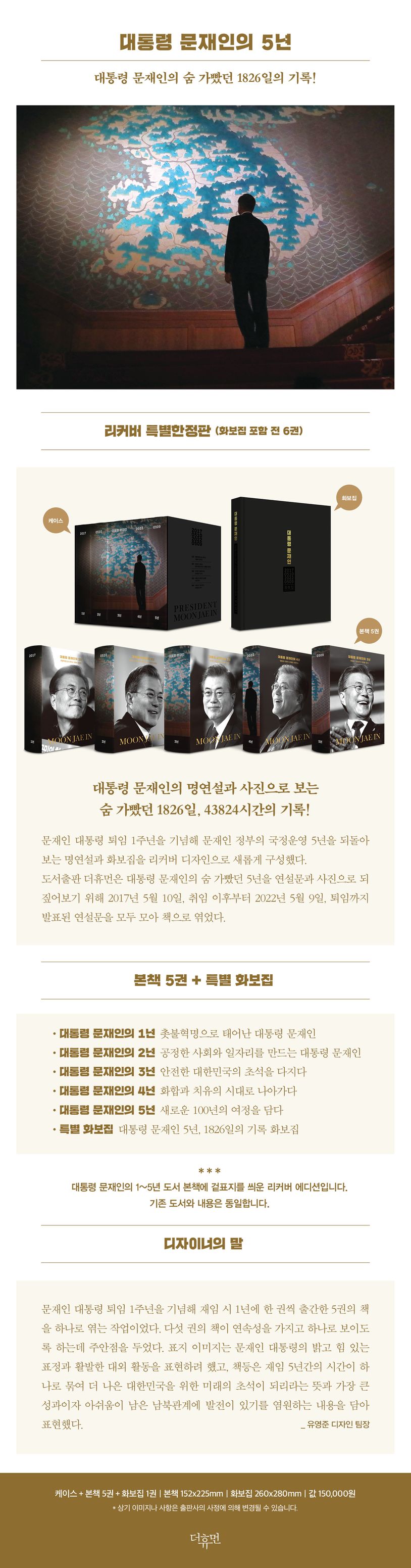 도서출판 더휴먼은 대통령 문재인의 숨 가빴던 5년을 연설문과 사진으로 되짚어보기 위해 2017년 5월 10일, 취임 이후부터 2022년 5월 9일, 퇴임까지 발표된 연설문을 모두 모아 책으로 엮었다.