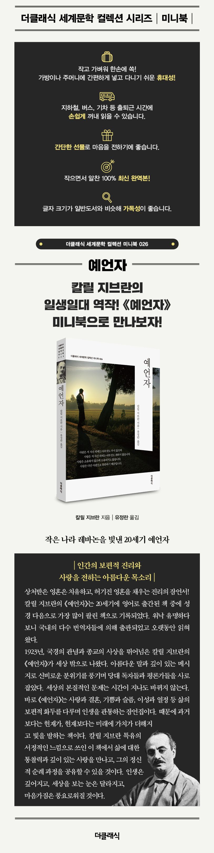 1923년, 국경의 관념과 종교의 사상을 뛰어넘은 칼릴 지브란의 《예언자》가 세상 밖으로 나왔다. 아름다운 말과 깊이 있는 메시지로 신비로운 분위기를 풍기며 당대 독자들과 평론가들을 사로잡았다. 세상의 본질적인 문제는 시간이 지나도 바뀌지 않는다. 바로 《예언자》는 사랑과 결혼, 기쁨과 슬픔, 이성과 열정 등 삶의 보편적 화두를 다루며 인생을 관통하는 잠언집이다. 때문에 과거보다는 현재가, 현재보다는 미래에 가치가 더해지고 빛을 발하는 책이다. 칼릴 지브란 특유의 서정적인 느낌으로 쓰인 이 책에서 삶에 대한 통찰력과 깊이 있는 사랑을 만나고, 그의 정신적 순례 과정을 공유할 수 있을 것이다. 인생은 깊어지고, 세상을 보는 눈은 달라지고, 마음가짐은 풍요로워질 것이다.