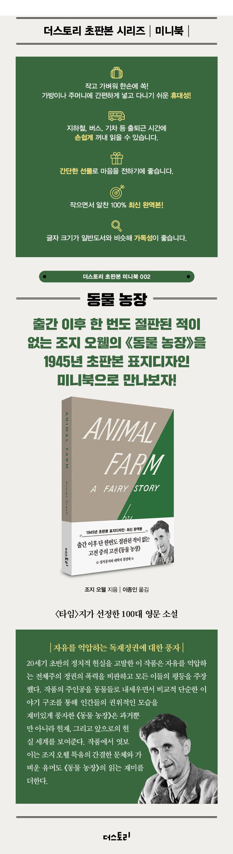 20세기 문학의 대표적인 작품으로 ‘풍자 우화’라는 창조성이 돋보이는 《동물 농장》은 1945년 출간한 지 2주 만에 초판이 모두 매진될 정도로 큰 인기를 얻었다. 그 후, 〈타임〉지가 선정한 100대 영문 소설, 한국 문인이 선호하는 〈세계 명작 소설 100선〉에 선정될 만큼 국내외 할 것 없이 큰 사랑을 받았다. 이 소설은 스탈린 독재하의 소비에트 체제를 비판, 풍자하는 작품으로 그 안에 사회주의에 대한 날카로운 비판이 집약돼 있다. 작가 고유의 빛나는 창의력과 가벼운 유머를 통해 권력욕에 의해 이념이 변질된 당시의 현실, 또 지금 우리의 모습을 반영한 조지 오웰 최고의 걸작을 감성적인 더스토리만의 초판본 표지디자인 미니북으로 만나 보자.