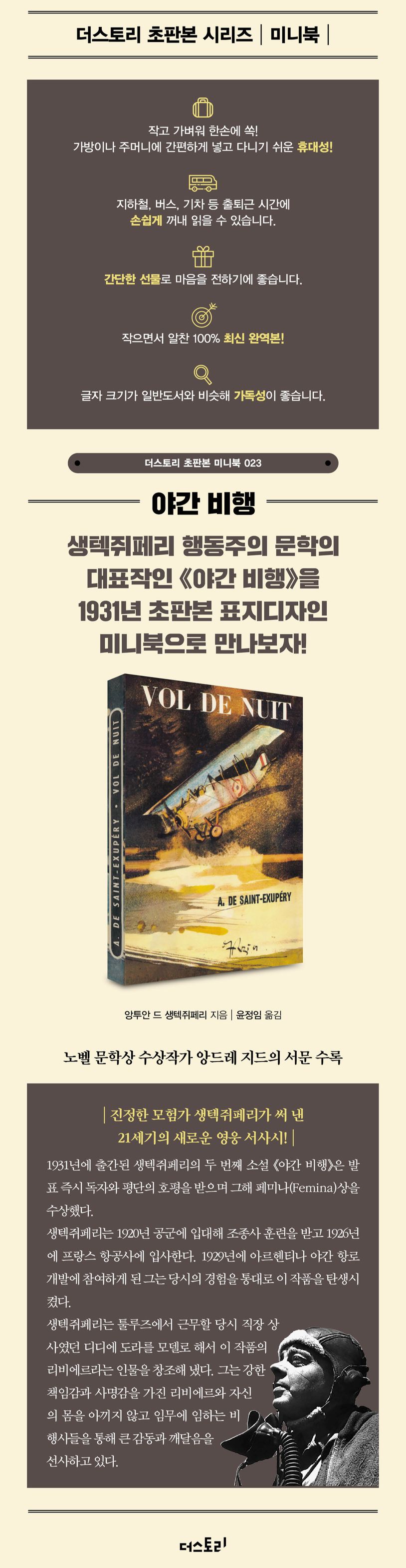 제1차 세계대전의 후유증을 겪고 있던 유럽의 작가들은 역사와 사회로 눈을 돌려 인간의 문제를 진지하게 성찰하게 되었다. 그들은 기존의 이데올로기에 편입되기보다는 근본적인 인간의 문제에 대해 고민했으며, 그것을 ‘행동’으로 표명하고자 했다. 그래서 그들은 ‘삶이 곧 작품이 되는 글쓰기’에 몰두했다. 앙드레 말로, 생텍쥐페리, 몽테를랑으로 대표되는 ‘행동주의 문학’은 이후 등장하는 실존주의 문학에도 크나큰 영향을 미치게 된다. 글을 쓰기 전에 우선 모험적인 행동에 뛰어들고, 그것을 작품으로 일궈낸 그들은, 때로는 죽음에 맞서기도 하면서 그 모험들이 단지 한 개인의 영웅담으로 그치지 않고, 인류의 위대한 힘을 보여 주려는 의지로 이어지도록 했다. 《야간 비행》의 마지막 부분에서 파이앵이 비행장으로 돌아오지 못할 것이라는 사실을 알게 된 리비에르는 절망하지 않고 유럽행 비행기에 이륙을 지시한다. 그리고 그는 다시 자신이 있었던 자리에서 불어 닥친 역경에 맞서 싸워나갈 것을 다짐한다. 그러한 그의 행동은 역경에 굴하지 않고 인간의 운명을 개척해 나가는 행동주의 문학의 표본으로 꼽을 수 있을 것이다. 더스토리만의 오리지널 초판본 표지디자인으로 생택쥐페리의 날고 싶은 자유로운 영혼이 담겨있는 명작 《야간비행》을 초판본 미니북으로 만나보자.