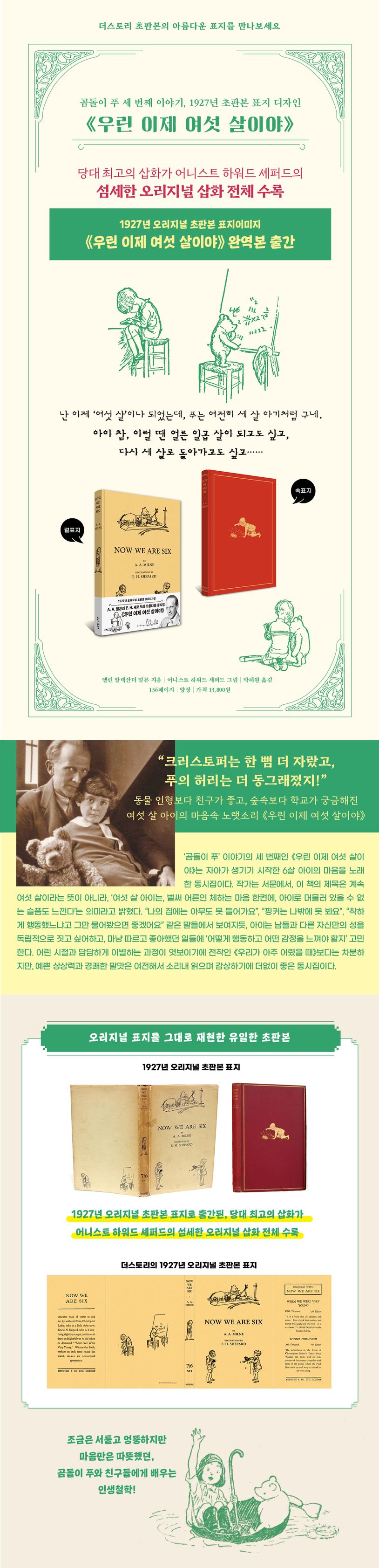 ‘곰돌이 푸’ 이야기의 세 번째인 《우린 이제 여섯 살이야》는 자아가 생기기 시작한 6살 아이의 마음을 노래한 동시집이다. 작가는 서문에서, 이 책의 제목은 계속 여섯 살이라는 뜻이 아니라, ‘여섯 살 아이는, 벌써 어른인 체하는 마음 한켠에, 아이로 머물러 있을 수 없는 슬픔도 느낀다’는 의미라고 밝혔다. “나의 집에는 아무도 못 들어가요”, “핑커는 나밖에 못 봐요”, “착하게 행동했느냐고 그만 물어봤으면 좋겠어요” 같은 말들에서 보여지듯, 아이는 남들과 다른 자신만의 성을 독립적으로 짓고 싶어하고, 마냥 따르고 좋아했던 일들에 ‘어떻게 행동하고 어떤 감정을 느껴야 할지’ 고민한다. 어린 시절과 담담하게 이별하는 과정이 엿보이기에 전작인 《우리가 아주 어렸을 때》보다는 차분하지만, 예쁜 상상력과 경쾌한 말맛은 여전해서 소리내 읽으며 감상하기에 더없이 좋은 동시집이다.