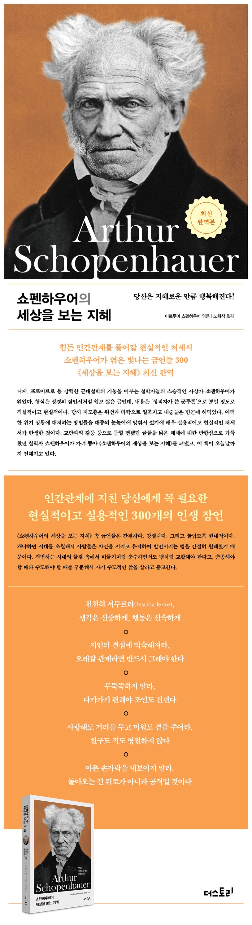 《쇼펜하우어의 세상을 보는 지혜》 속 금언들은 간결하다. 강렬하다. 그리고 놀랍도록 현대적이다. 왜냐하면 시대를 초월해서 사람들은 자신을 지키고 유지하며 발전시키는 법을 간절히 원해왔기 때문이다. 격변하는 시대의 물결 속에서 비둘기처럼 순수하면서도 뱀처럼 교활해야 한다고, 순종해야 할 때와 주도해야 할 때를 구분해서 자기 주도적인 삶을 살라고 충고한다.