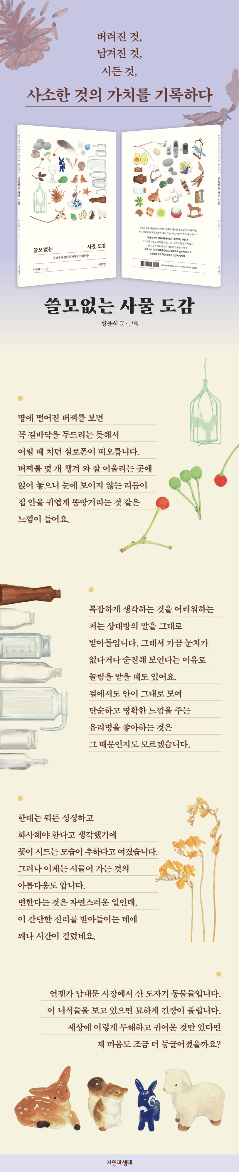 길에서 주운 나뭇가지나 깃털, 오래된 핸드폰과 쓰고 남은 유리병, 시든 꽃다발과 포장 선물에 딸린 리본, 자그마한 인형과 장식품……. 보잘것없어 보이는 사물 속 아름다움을 하나하나 꺼내어 다듬고 반질반질 윤기를 내어 담은 그림 에세이입니다.