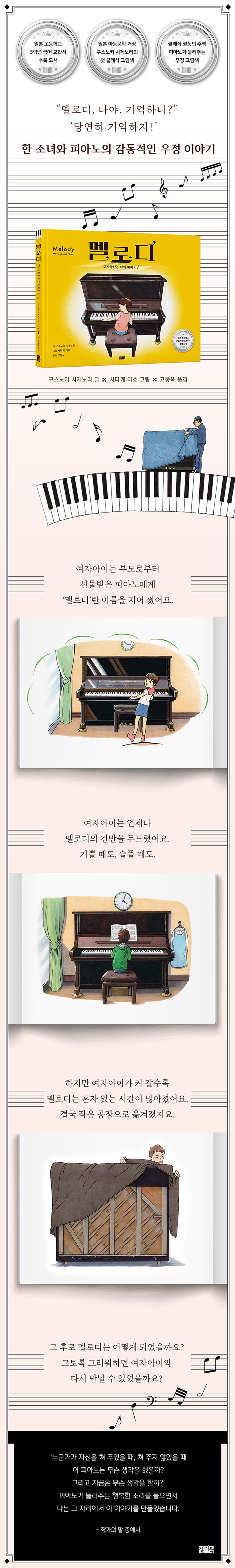 일본 아동문학을 대표하는 구스노키 시게노리 작가는 한동안 방치되었던 피아노가 말끔히 수리되어 다시 연주되었을 때 어떤 마음이었을지 생각해 보고 이 이야기를 만들어 냈다. 한 소녀와 그 소녀가 ‘멜로디’란 이름을 지어 준 피아노. 기나긴 시간 동안 이들이 나눈 우정 이야기는 사타케 미호 작가의 따뜻하고 섬세한 그림으로 아름답게 펼쳐진다.