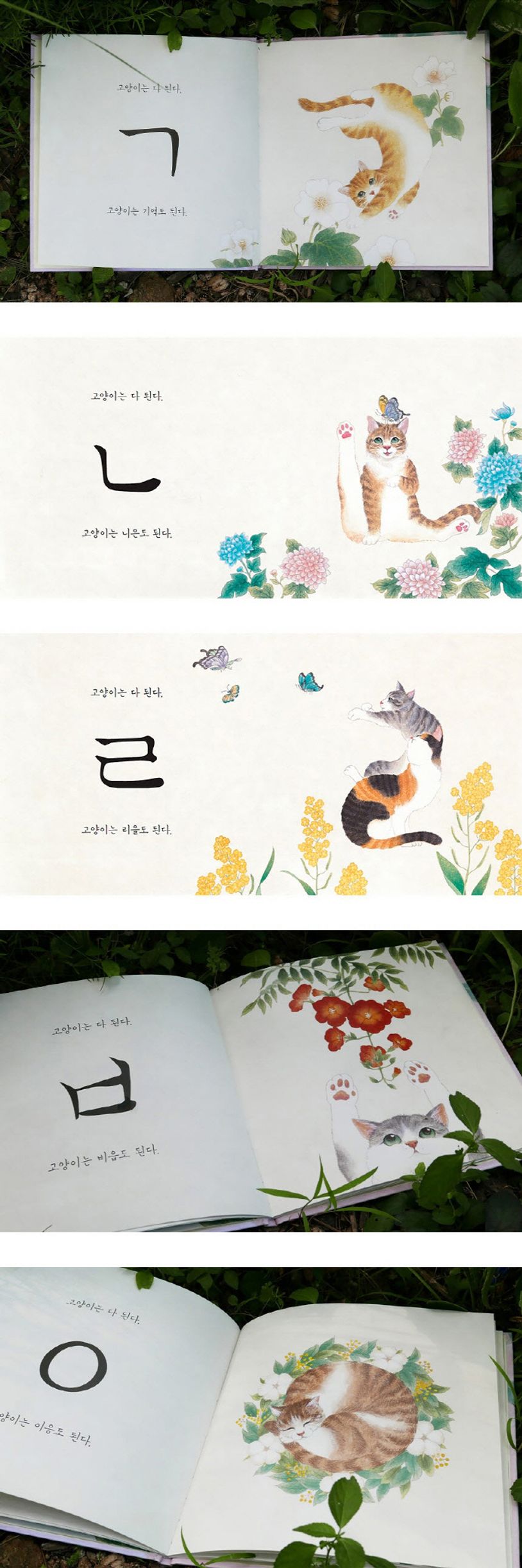 꽃밭에서 폴짝 뛰어올라 기역처럼 몸을 유연하게 늘인 고양이, 이응처럼 몸을 동그랗게 말고 낮잠을 자는 고양이, 날아가는 꿀벌을 바라보느라 키읔 포즈로 서 있는 고양이 등 섬세하고 고운 한국화 기법으로 그려진 귀엽고 발랄한 고양이들을 만날 수 있습니다. 유연하고 개성 넘치는 고양이들의 모습이 섬세한 붓질로 생생하게 담겼고, 고운 빛깔의 꽃들이 곁들여져 그림이 더욱 화사하고 풍성해졌습니다.