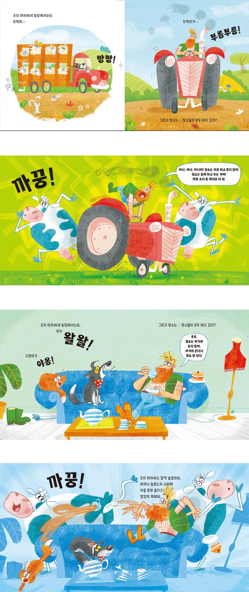분명 젖소들이 음매 하고 울어야 하는데 조지 아저씨네 농장의 젖소들은 조금 이상해요. 놀래기 장난을 좋아하나 봐요. 어디선가 갑자기 짠 하고 나타나서는 까꿍! 하고 울거든요. 그래서 조지 아저씨를 깜짝 놀라게 하지요.