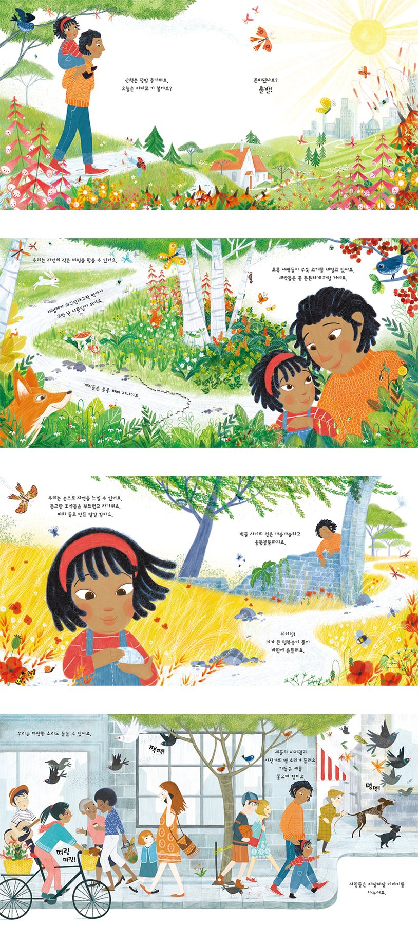 〈산책은 정말 즐거워〉는 산책의 즐겁고 행복한 모습을 보여 주어요. 산책을 하며 만날 수 있는 다양한 자연의 모습을 보여 주지요. 산책길에서 만날 수 있는 또 다른 모습에는 어떤 것들이 있는지 함께 가 보아요.