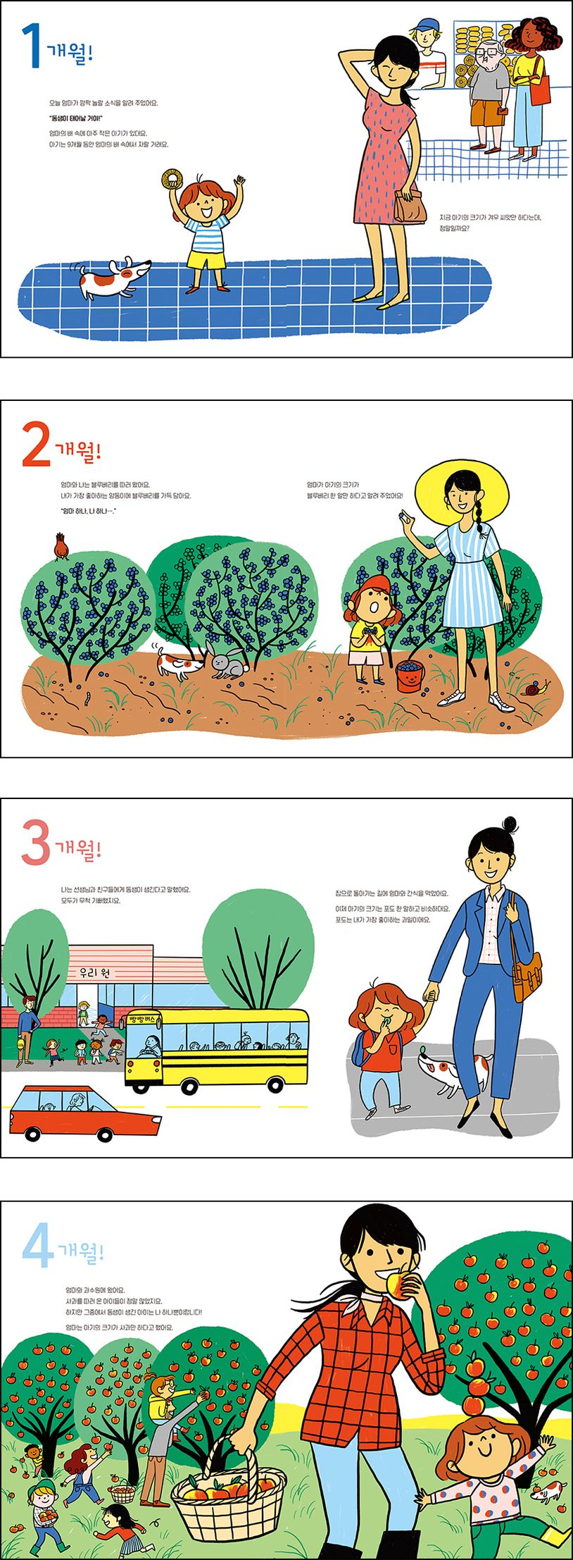오늘 엄마가 깜짝 놀랄 소식을 알려 주었어요. 바로 엄마의 배 속에 아주 작은 아기가 있다는 것이에요. 나에게도 동생이 생기는 것이지요. 지금 아기의 크기가 씨앗만 하다는데, 정말일까요? 엄마의 배 속에 아기가 생긴지 2개월이 되었을 때 우리는 블루베리를 따러 갔어요. 블루베리는 내가 가장 좋아하는 것이지요. 엄마는 지금 아기의 크기가 블루베리 한 알만 하다고 했어요. 아기는 그렇게 조금씩 자라는 것일까요?