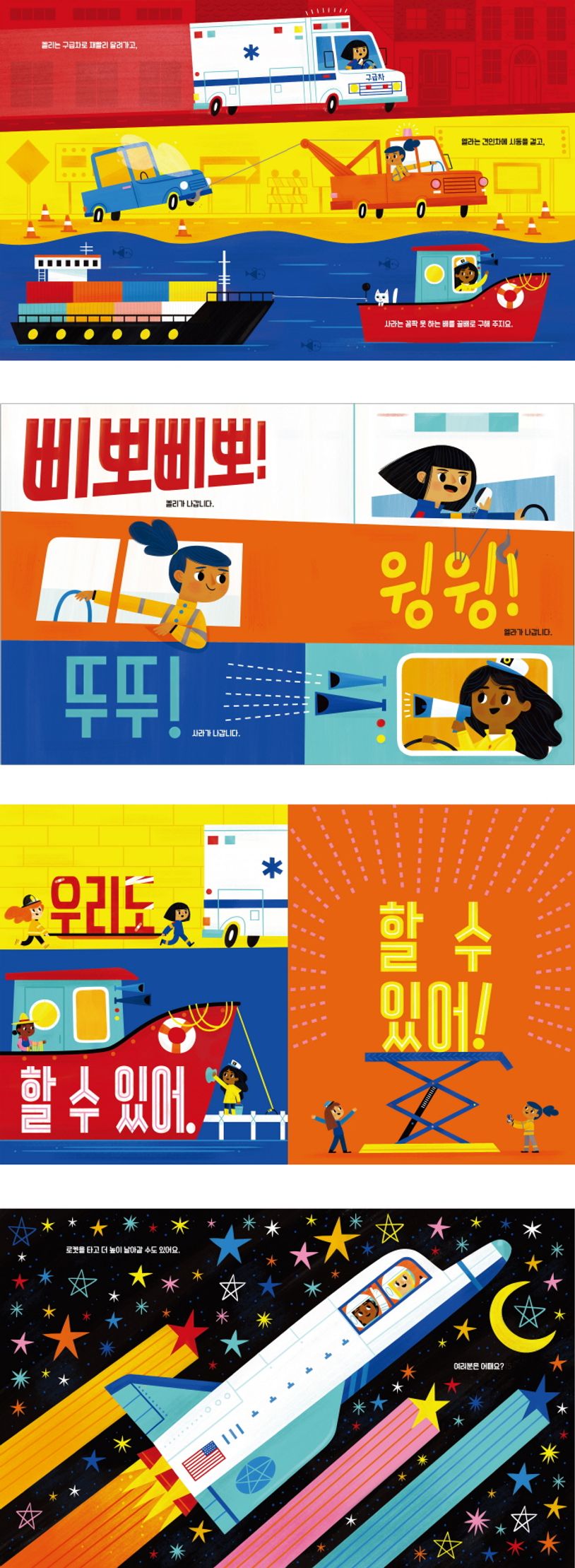 이 책에 등장하는 모든 탈것들을 운전하는 주인공은 바로 소녀들입니다. 보통 그림책에서 그리는 소녀들의 이미지와는 사뭇 다르지요. 때로는 힘차게, 강인하고, 자신 있게 소녀들은 아주아주 커다란 탈것들을 운전합니다. 그리고 이 세상의 수많은 소녀들에게 할 수 있다고 외칩니다. 다양한 의성어ㆍ의태어를 개성 넘치는 타이포그래피로 표현해 소녀들의 강인함과 자신감을 담아낸 〈우리도 할 수 있어!〉를 만나 보세요!
