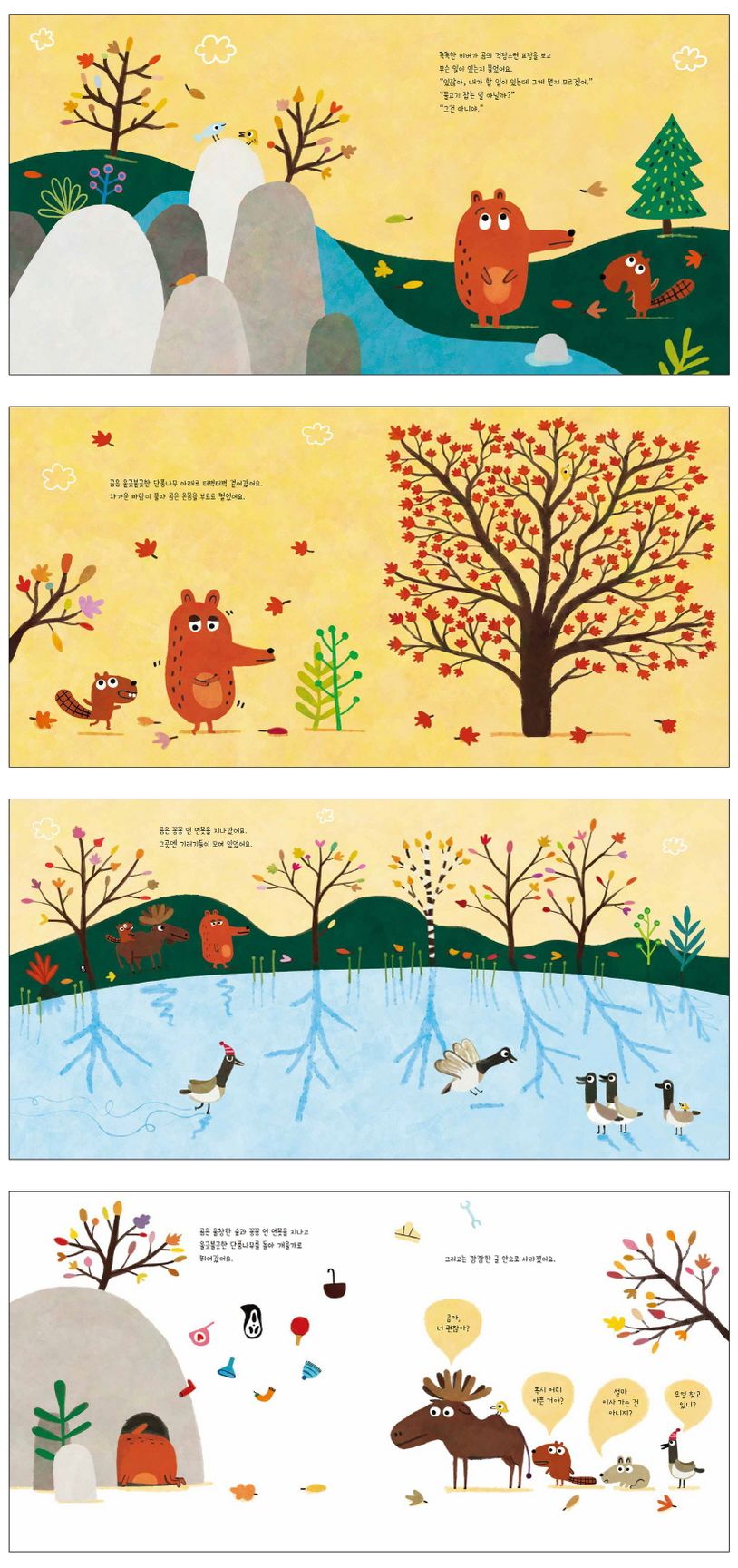 숲에 가을이 왔어요. 낙엽이 쌓이고, 차가운 바람이 불어요. 단풍잎이 울긋불긋 물들고, 연못이 꽁꽁 얼기 시작하지요. 곰은 가을 냄새를 맡으며 몸을 부르르 떨었어요. 이제 곰이 꼭 해야 할 일이 무엇인지 알 것 같나요?