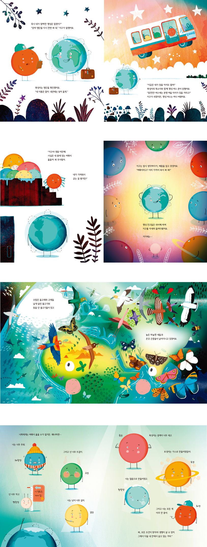 다른 행성들에는 생명들이 살 수 없어요. 해왕성은 너무 추워서, 수성은 너무 뜨거워서, 명왕성은 너무 작고, 금성은 낮이 너무 길어서요. 또 목성은 중력이 너무 세고, 토성은 가스로 만들어지고, 천왕성은 얼음으로 만들어져서 생명들이 살기 어려워요. 지구의 설명에 행성들은 큰 깨달음을 얻었답니다.