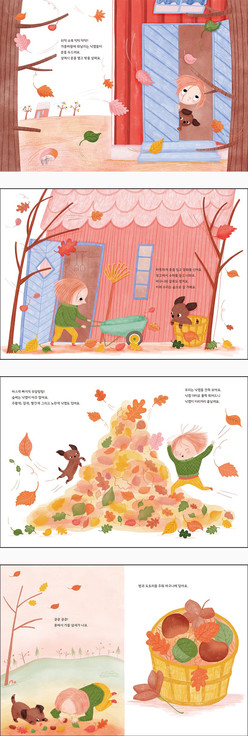 가을바람에 휘날리는 낙엽들이 문을 두드려요. 그 소리에 살며시 문을 열고 밖을 살펴요. 따뜻하게 옷을 입고 장화를 신고, 숲으로 갈 준비를 해요. 모든 준비를 마쳤다면 이제 숲으로 떠나요. 숲에는 바스락바스락 낙엽이 아주 많아요. 알록달록한 낙엽을 잔뜩 모아 더미를 만들고 그 위로 폴짝 뛰어드니 낙엽이 이리저리 흩날려요. 킁킁 땅 냄새를 맡기도 하고, 땅에 떨어진 도토리와 밤도 주워요. 가을을 맞이한 숲은 재미있어요.