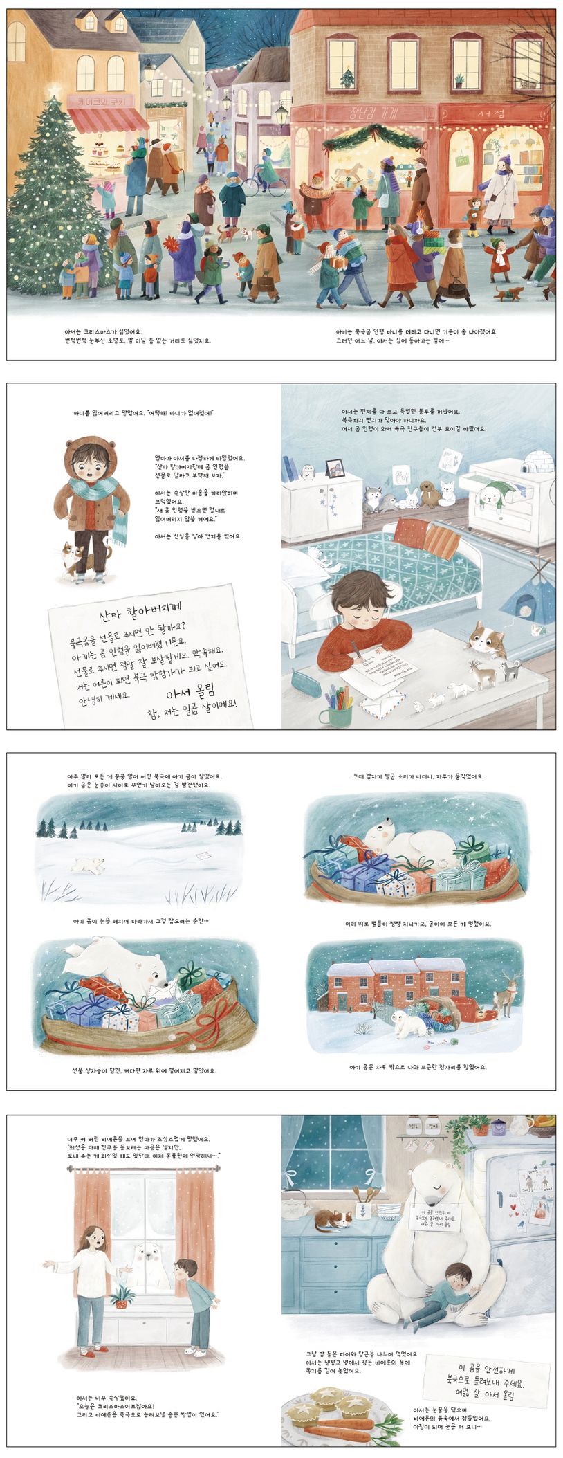 〈크리스마스가 보내 준 북극곰〉은 북극에 살던 아기 북극곰이 우연히 산타 할아버지의 선물 자루 속으로 들어가 루돌프의 썰매를 타고, 아서의 선물이 되는 아주 사랑스러운 이야기예요. 곰 인형을 갖고 싶어 하는 아서에게 북극곰은 아주 커다란 선물이 되었지만, 아서는 곧 중요한 사실을 깨닫지요. 북극곰은 북극에서 살아야 한다는 것을요. 북극곰을 진심으로 생각한 아서는 북극곰을 집으로 돌려보내 줍니다. 아서의 진심이 통한 걸까요? 북극곰을 그리워하는 아서 앞에 산타 할아버지가 나타나지요. 산타 할아버지가 둘을 만나게 해 줄까요? 특별한 우정 이야기를 그린, 크리스마스 선물 같은 그림책 〈크리스마스가 보내 준 북극곰〉. 아서와 북극곰의 특별한 크리스마스 이야기를 만나 보세요.