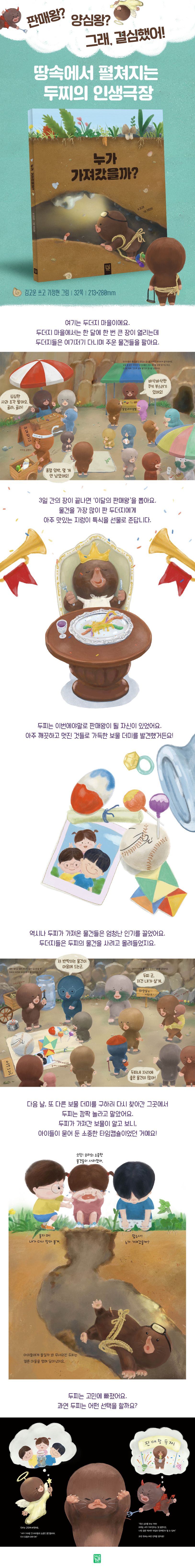 땅속 두더지 마을에서는 한 달에 한 번, 3일 동안 장이 열려요. 두더지들은 한 달 동안 땅속을 돌아다니며 모아 둔 음식과 물건을 사고팔지요. 장이 끝나면 ‘이달의 판매왕’을 뽑아 지렁이 특식을 선물로 주고, 동네방네 얼굴 박힌 전단이 뿌려져요. 그래서 ‘이달의 판매왕’이 되는 건 두더지들에게 아주 명예로운 일이랍니다.