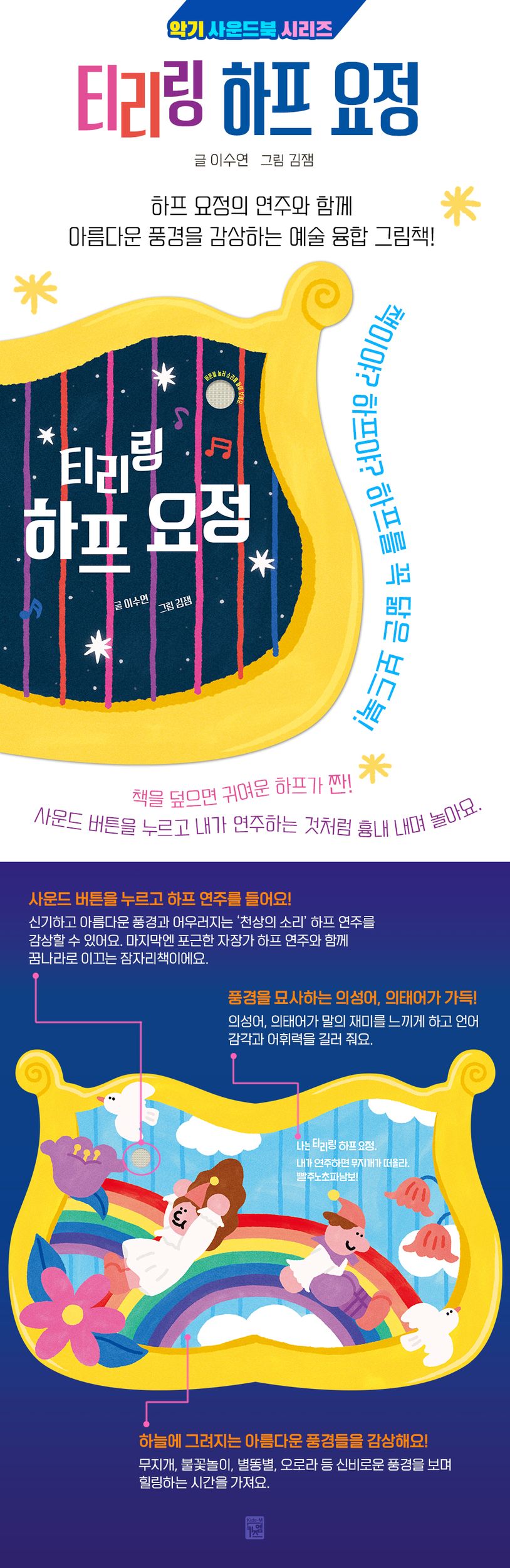 음악의 단순 정보나 지식 전달이 아닌, 다양한 방식으로 접근해 음악을 즐기도록 이끄는 예술 융합 보드북 시리즈를 소개합니다. 악기 모양 그대로 만들어 장난감처럼 재미있게 접하는 보드북으로, 페이지마다 음원 버튼을 누르면, 직접 이야기에 참여하며 악기 소리 음원을 감상할 수 있습니다. 악기 사운드북 시리즈 세 번째 그림책 〈티리링 하프 요정〉을 만나 보세요!