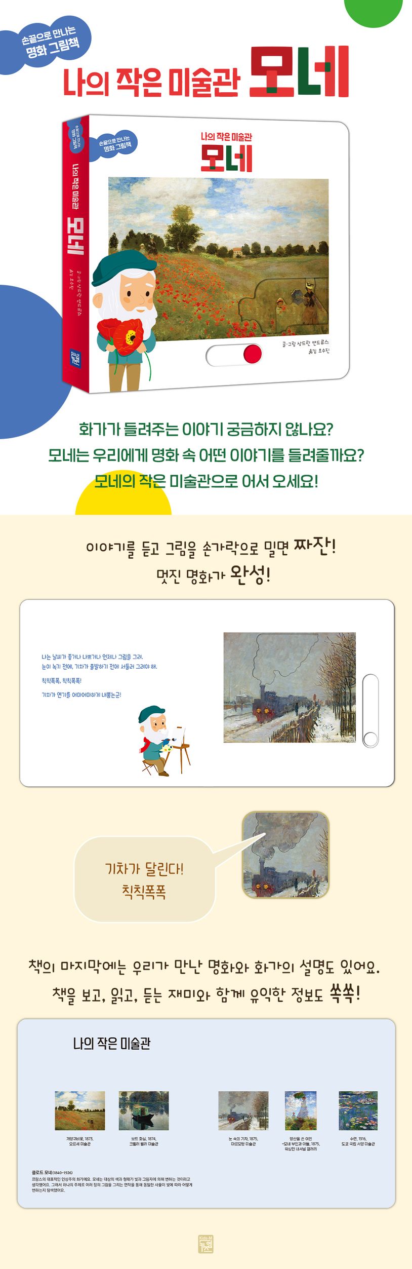 프랑스의 인상주의 화가 모네가 그림 이야기를 들려줘요. 모네가 들려주는 이야기에 귀를 기울이며 그림을 보면 마치 모네의 그림 속에 들어와 있는 것 같아요. 손가락으로 슬라이더를 밀면 그림이 움직이며 명화가 완성된답니다. 화가의 이야기도 들어보고, 명화도 감상하며 아이의 문화 예술 감각을 길러 주세요.