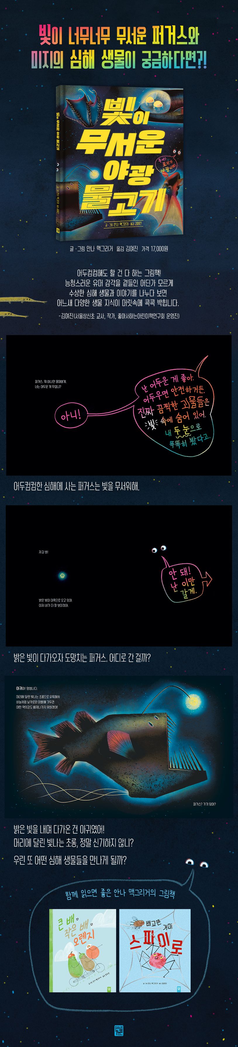 햇빛이 닿지 않는 바다의 가장 깊고 어두운 곳. 그곳에도 생물들이 살고 있어요. 퍼거스처럼 말이에요. 아무것도 보이지 않는 심해에서 퍼거스는 목소리만 낼 뿐 모습을 드러내지 않아요. 그림책 속 화자는 퍼거스의 이야기를 힌트 삼아 생김새를 유추하지요. 그럴수록 퍼거스에 대한 호기심은 점점 더 커져 갑니다. 그리고 심해 생물들이 하나둘씩 모습을 드러냈어요. 갑자기 등장한 심해 생물이 무서운지 퍼거스는 도망쳤어요. 화자는 심해 생물을 만나 기분이 무척 좋았어요. 하지만 심해 생물은 금세 시야에서 사라지고 말았지요. 어디로 간 것인지 도무지 알 수 없었어요. 퍼거스와 심해 생물 들은 대체 어디로 간 걸까요? 다시 만날 수 있을까요? 〈빛이 무서운 야광 물고기〉에서 퍼거스와 심해 생물을 만나 보세요!
