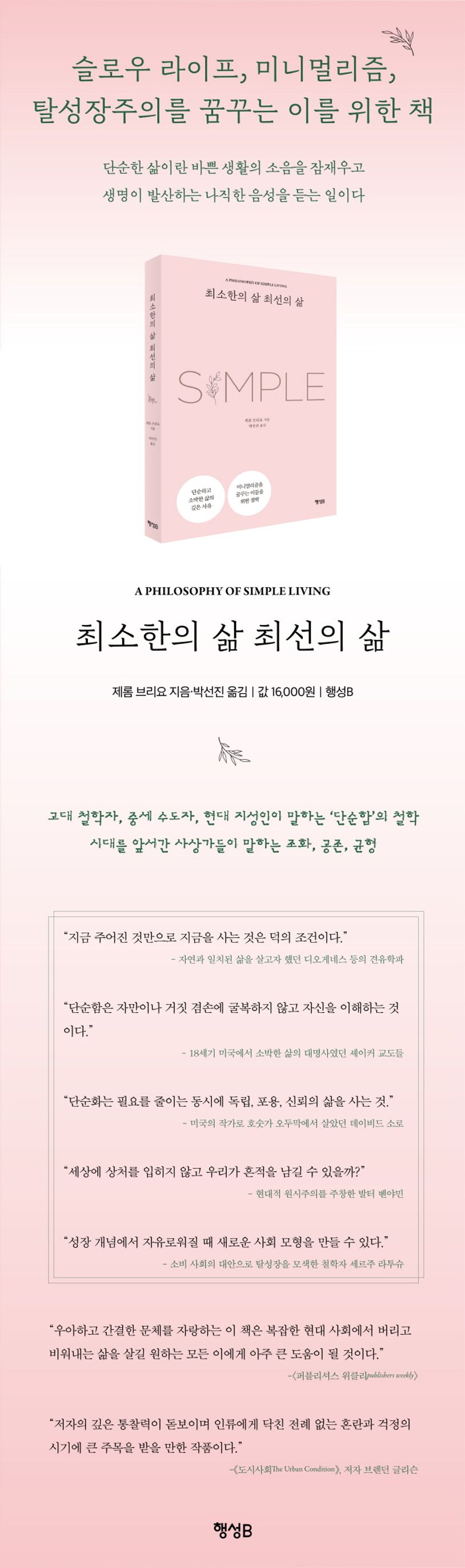 이 책은 물건을 정리하는 법이나 생각을 비우는 법을 알려주지 않는다. 그보다 더 근원적이고 총체적인, 단순하고 소박한 삶의 의미를 짚어본다. 탈성장주의와 자연과의 공존, 미니멀리즘을 꿈꾸는 이들에게 든든한 철학적 사유를 더해줄 것이다.