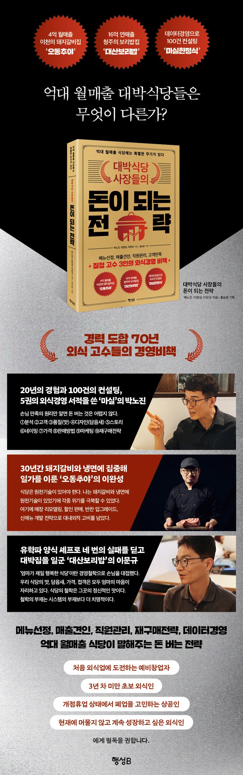 경력 도합 70년을 자랑하는 외식업계의 베테랑들이지만 저자들은 뼈아픈 폐업을 경험한 쪽박식당 출신이다. 이들은 폐업 앞에서 깨달은 지혜를 바탕으로 심기일전해 뚝심 있는 맛과 유연한 경영 노하우로 지금의 대박식당을 이뤄냈다.