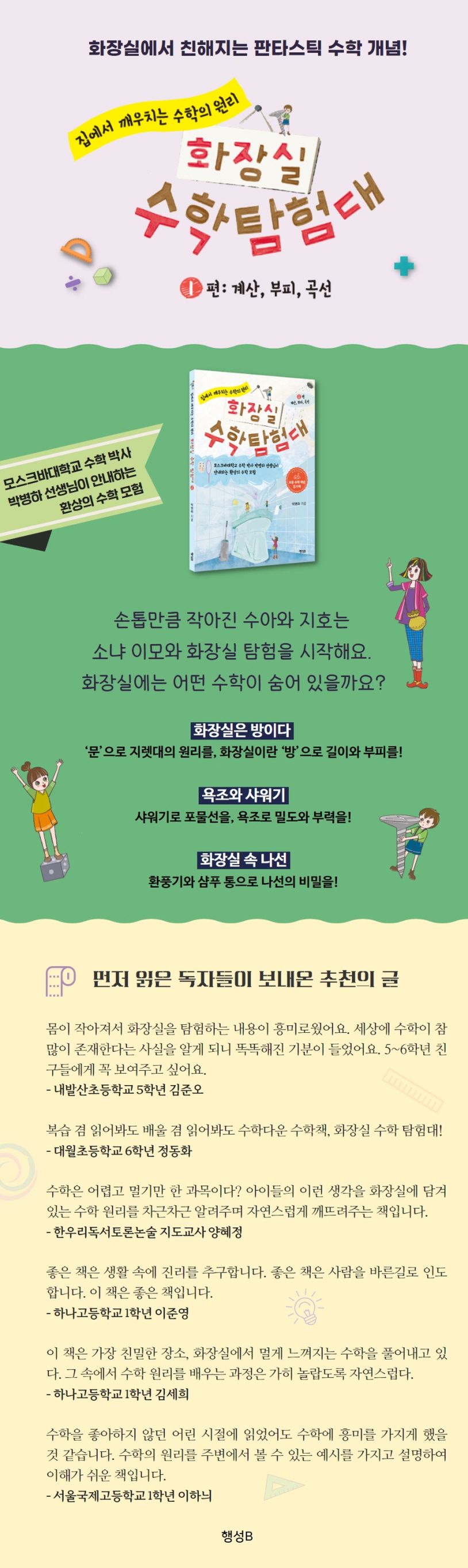 수학을 왜 배우는지 모르겠고, 수학은 교실에만 있다고 생각하는 어린이들을 위한 수학 동화다. 매일 사용하는 화장실에서 주인공들은 수많은 수학 개념을 만난다. 문에서 지렛대와 회전을, 화장실이란 ‘방’에서 넓이와 부피 그리고 계산을, 욕조와 샤워기에서 밀도와 부력, 포물선을 발견한다.