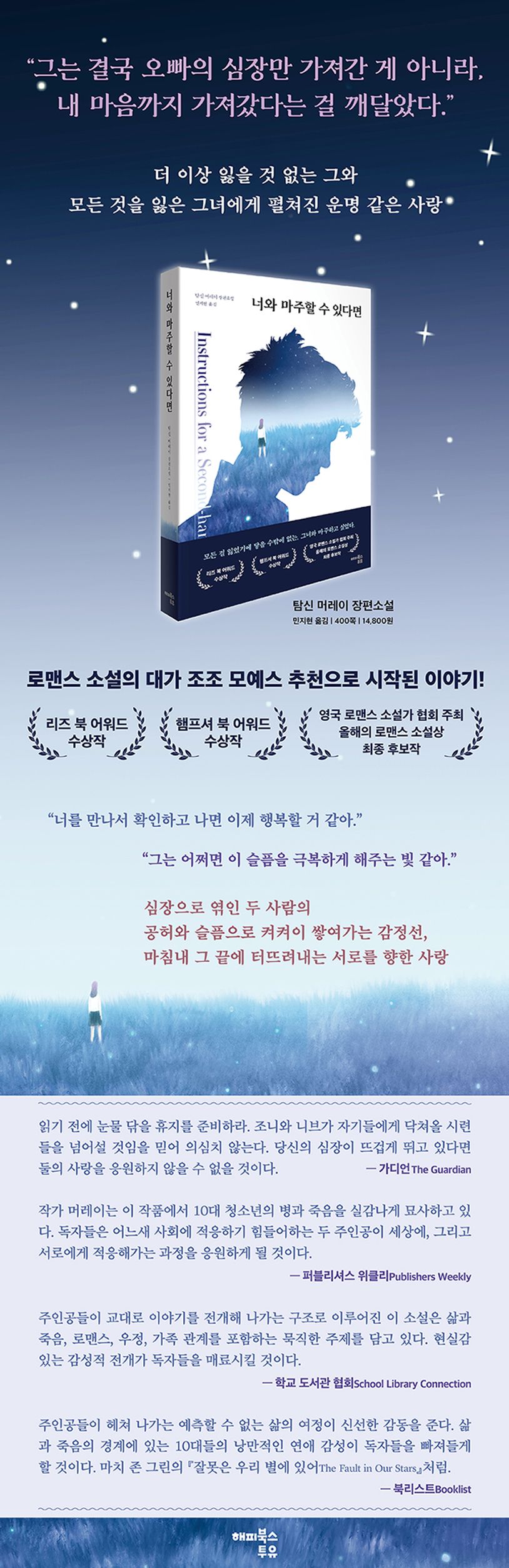 『너와 마주할 수 있다면』은 인공심장으로 평생을 살다 기적적으로 심장 이식을 받은 조니의 눈에 사고로 쌍둥이 오빠를 잃은 기증자의 여동생이 들어오며 이야기가 펼쳐진다. 살기 위해 버둥거리다 보니 점점 깊은 구덩이로 빠지던 두 사람의 만남. 공허와 슬픔이 켜켜이 쌓여 고개만 겨우 빼꼼 내밀고 숨을 쉬며 살아가던 두 사람 사이에, 독인지 약인지 알 수 없는 관계에서, 그리고 삶과 죽음의 경계에서 피어나는 로맨스가 시작된다.