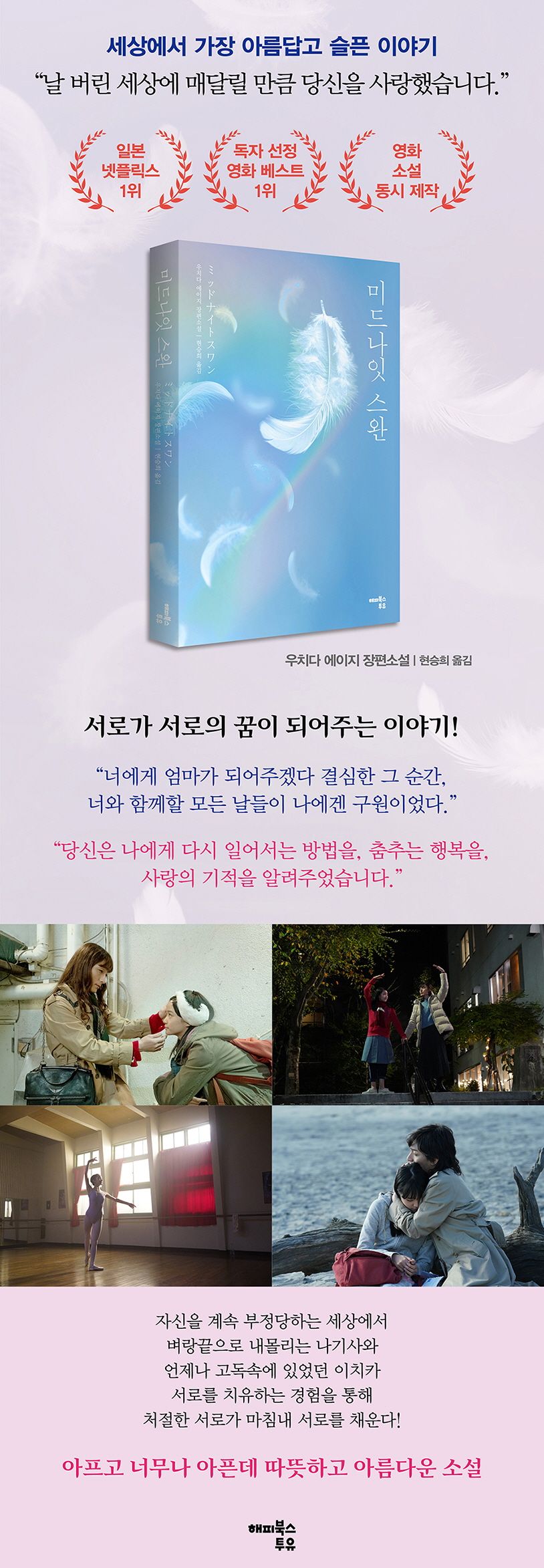 우리에게는 ‘초난강’이라는 이름으로 더 유명한 일본의 탑배우 구사나기 츠요시와 이 영화 한편으로 최고의 스타덤에 오른 신예 핫토리 미사키가 주연한 〈미드나잇 스완〉은 제44회 일본아카데미상에서 최우수 작품상을 비롯 9개 부문을 휩쓸며 그해 최고의 영화로 손꼽혔다. 이어 유수한 해외 영화제와 외신기자협회, 비평가들에게 최고의 찬사를 받으며 전 세계 10여 개국에서 개봉되었고, 2023년 5월 일본 넷플릭스에 론칭하자마자 단숨에 시청 순위 1위에 오르며 관객들의 찬사를 한 몸에 받았다.