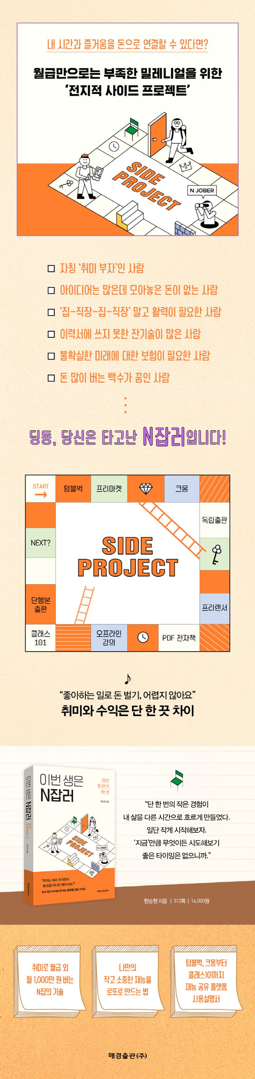이 책은 취미로 시작해 프로N잡러가 된 저자의 경험을 바탕으로 노동력을 투입해 수익을 내는 ‘액티브 인컴’과 수익의 자동화를 만드는 ‘패시브 인컴’이라는 두 가지 방식의 ‘사이드 프로젝트’를 소개한다. 나만의 재능을 발견하는 법부터 텀블벅, 클래스101, 크몽 등 ‘재능 공유 플랫폼’을 활용해 취미를 돈으로 연결하는 법, 직장생활과 N잡을 효율적으로 운용하는 노하우, 마지막으로 실제 수익 인증까지, 평범한 직장인이 월급에 의존하는 삶에서 벗어나 경제적 독립을 이루기까지의 모든 과정을 아낌없이 보여준다.