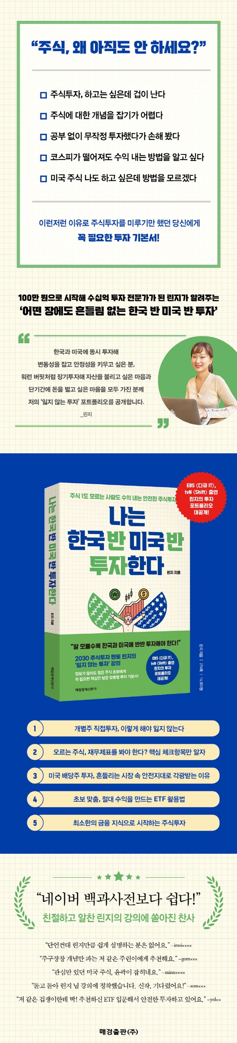 《나는 한국 반 미국 반 투자한다》는 린지의 투자 철학과 투자 방법이 총망라된 책으로, 종목 선정 방식, 적정주가 산출 방법뿐 아니라 주린이 눈높이에서 재무제표와 증권사 리포트 보는 법까지 담았다. 또한 해외 주식이 두려운 주린이가 자신감을 키울 수 있도록 ETF 투자, 미국 주식투자의 기본도 다뤘다. 또한 린지의 투자 포트폴리오 또한 엿볼 수 있다. 주식, 어려워서, 잘 몰라서, 힘들어서 주저하고 공부하기를 게을리했던 주린이라면 이제 ‘(한국)반 (미국)반 투자’로 처음부터 수익 내는 투자를 시작해보자. 이 책이 든든한 안내자가 되어줄 것이다.