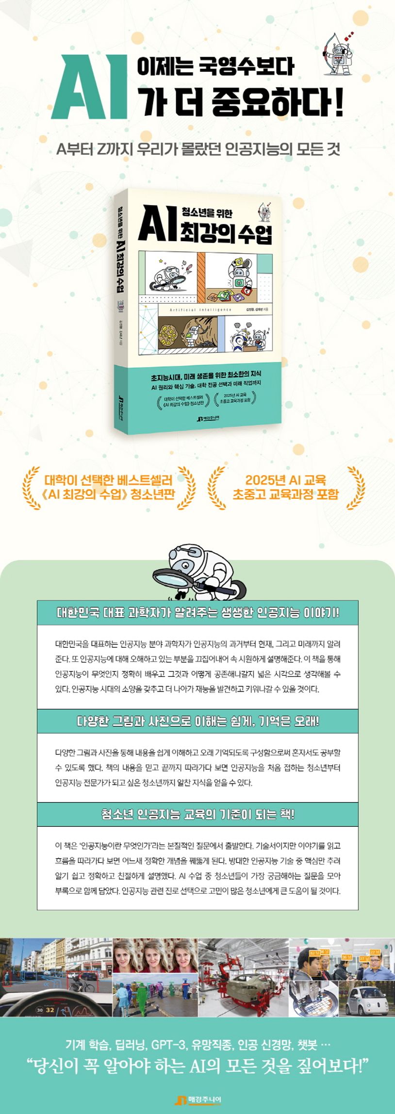AI에 대한 책은 많다. 하지만 현상에 대한 책들이 대부분이다. 요즘 어떤 놀라운 일들이 벌어지고, 앞으로 더욱 놀랄 어떤 일들이 벌어질 것이라는 현실 진단과 예측만 담아내고 있다. 『청소년을 위한 AI 최강의 수업』은 한 발 더 나아간다. 대한민국 대표 과학자가 막연하게 설명하던 인공지능의 명확한 실체를 알려주고 다가올 미래의 변화를 생생하게 이야기해준다. 이 책을 통해 인공지능이 무엇인지 정확히 배우고 앞으로 그것과 어떻게 공존해나갈지 넓은 시각으로 생각해볼 수 있다. 인공지능 시대에 적합한 자신의 강점을 발견하고 키워나갈 수 있을 것이다. 또한 청소년들이 궁금해하는 ‘인공지능 시대의 일자리’에 대한 이야기와, AI 수업 중 가장 궁금해하는 질문을 모아 부록으로 함께 담았다. 인공지능 관련 진로 선택으로 고민이 많은 청소년에게 큰 도움이 될 것이다.
