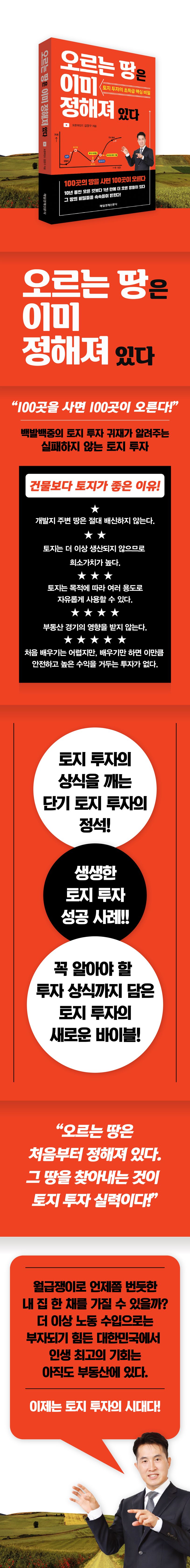 이 책은 총 8장으로 구성되어 있다. 1장 ‘토지 투자의 새로운 정석’에서는 토지 투자는 장기간 보유해야 수익이 난다는 기존의 인식을 깨고, 단기간에 엄청난 수익을 내는 지은이만의 토지 투자 방식을 소개한다. 2장 ‘성공의 반은 만남에서 시작된다’에서는 지은이를 만나 인생이 바뀐 어느 투자자의 기고문과 투자에서 만남을 소중히 해야 하는 이유 등에 대해 이야기한다. 3장 ‘오르는 땅은 이미 정해져 있다’에서는 땅이 쌀 때 사서 비싸게 파는 방법, 오르는 땅의 매도·매입 사례 등을 보여준다. 4장 ‘토지의 입지분석·권리분석의 중요성’에서는 입지분석과 권리분석의 중요성, 임야등록전환, 개발지 주변 땅값이 오르는 메커니즘 등을 살펴본다. 5장 ‘실감 나는 토지 매수 이야기’는 제목 그대로 지은이가 매수했던 좋은 땅에 얽힌 에피소드를 흥미롭게 들려준다. 6장 ‘토지 개발 이야기’에서는 개발을 통해 수익을 극대화하는 방법을 알아보고, 7장 ‘성공한 토지 매매 이야기’에서는 큰 땅을 작게 만들거나, 문제가 있는 땅을 해결하거나, 무허가 주택 등을 잘 해결해서 땅의 가치를 올렸던 사례를 살펴본다. 마지막으로 8장 ‘꼭 알아야 할 토지 투자 상식 이야기’에서는 현황도로, 구거, 국유지, 개발부담금, 주위토지통행권, 기획 부동산 회사 등 토지 투자에서 꼭 알아야 할 상식을 배워본다.